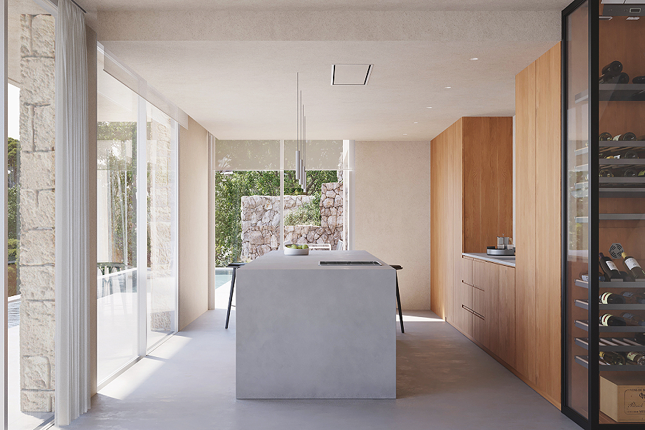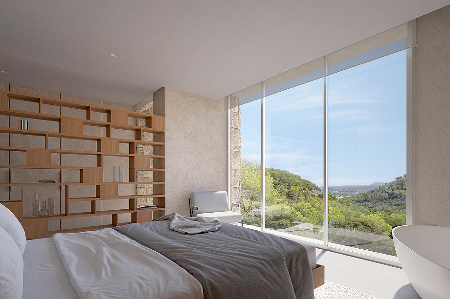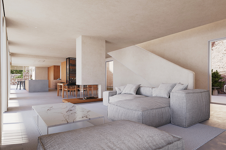 Los interiores de Ca MALVA se definen por la luz natural y la amplitud de los espacios. Grandes ventanales enmarcan vistas panorámicas al mar y a la montaña, mientras que una paleta de tonos neutros y texturas naturales genera una atmósfera tranquila y atemporal. La madera, la piedra y las telas suaves aportan calidez a una geometría limpia y depurada, creando espacios refinados y acogedores que refuerzan el carácter mediterráneo de la vivienda y su conexión con el entorno inmediato.