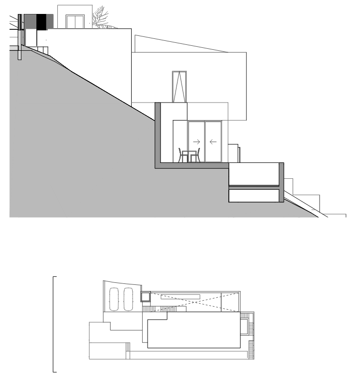 Destaca especialmente una bañera exterior situada en uno de los dormitorios, con la propia roca natural de la montaña como telón de fondo y el cielo como cubierta, generando un espacio singular. En la misma línea, el acceso a la vivienda se produce a través de un patio inglés tallado en la roca, acompañado por una lámina de agua y vegetación, que establece una transición gradual entre la montaña y la arquitectura.