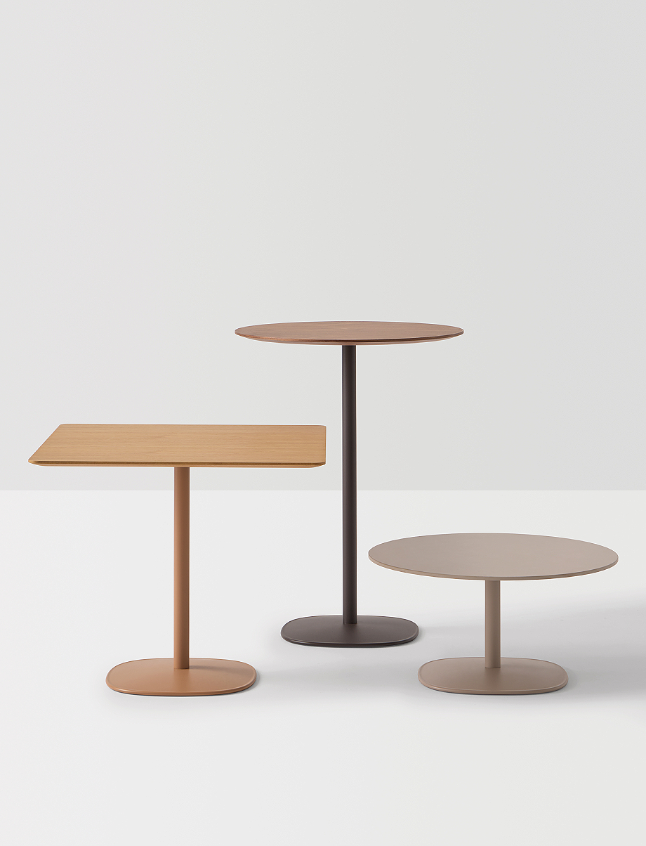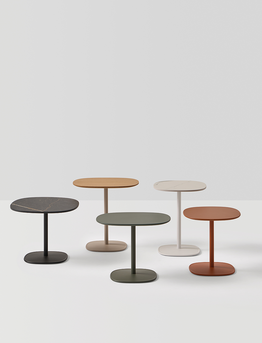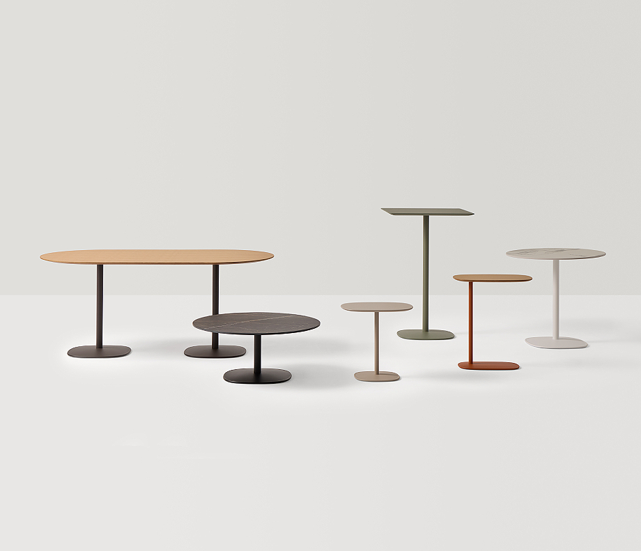 FLOE se caracteriza por su diseño, que se integra con facilidad en espacios modernos para favorecer la interacción social y el trabajo informal. La colección se estructura en torno a tres tipos de bases de aluminio, permitiendo configurar desde mesas auxiliares hasta mesas de bar y cafetería, siempre ligeras y fáciles de mover según las necesidades de cada espacio.
