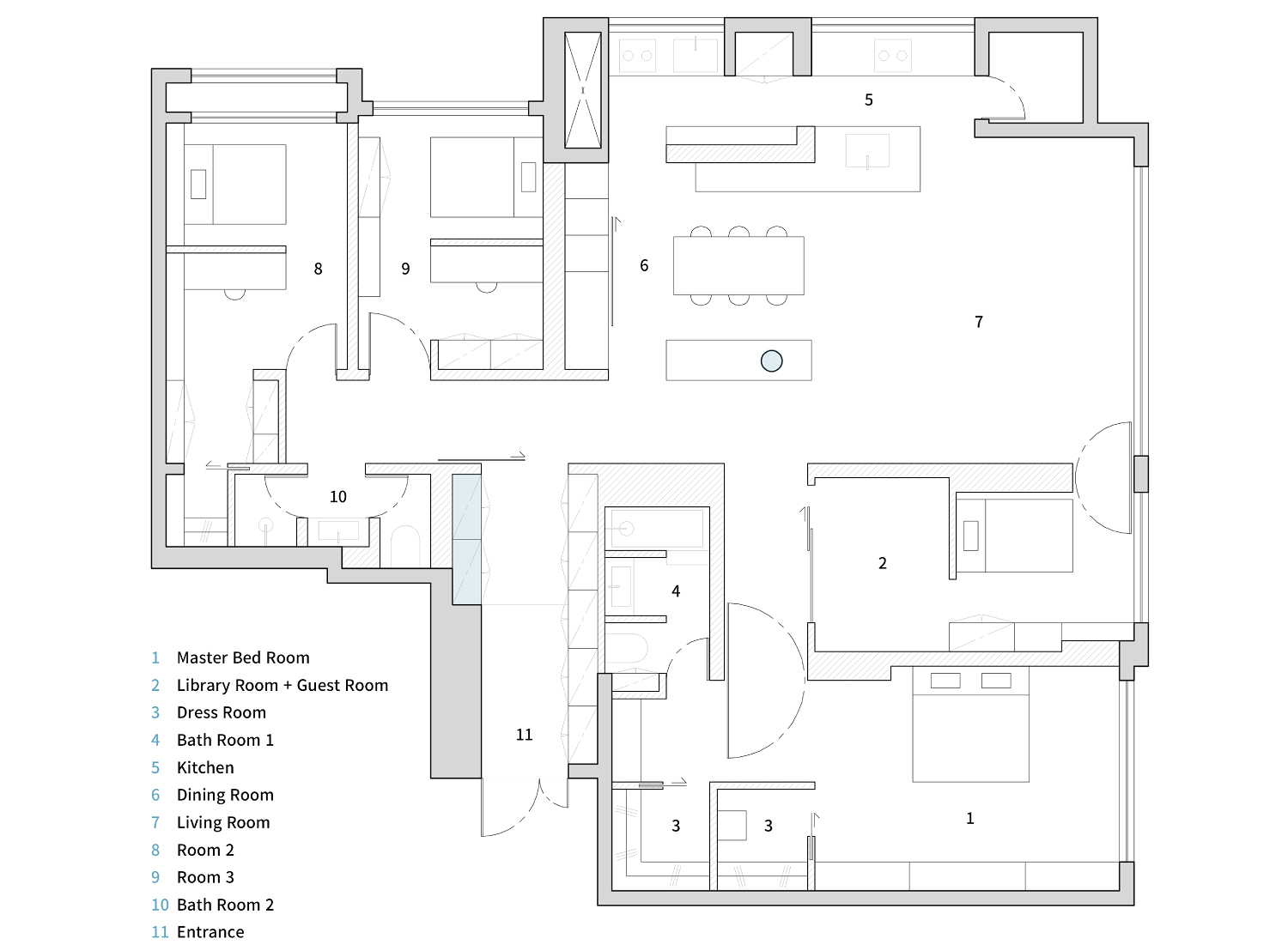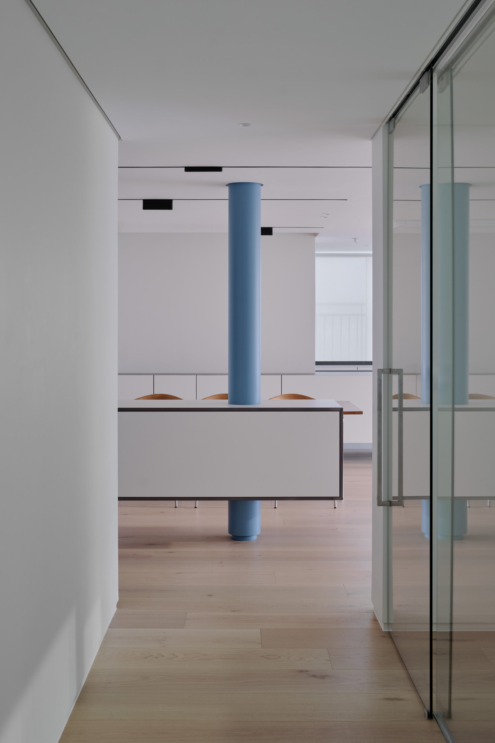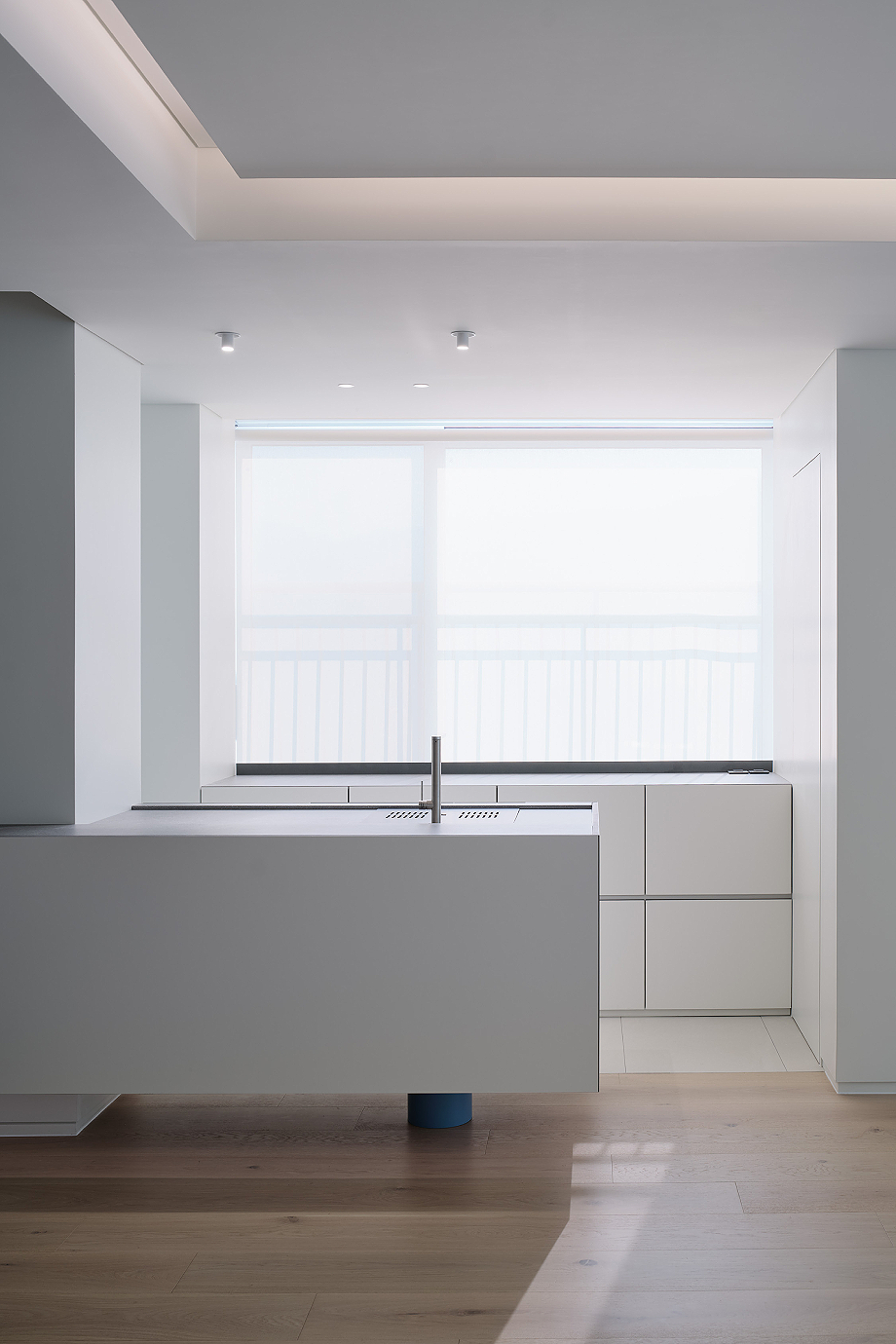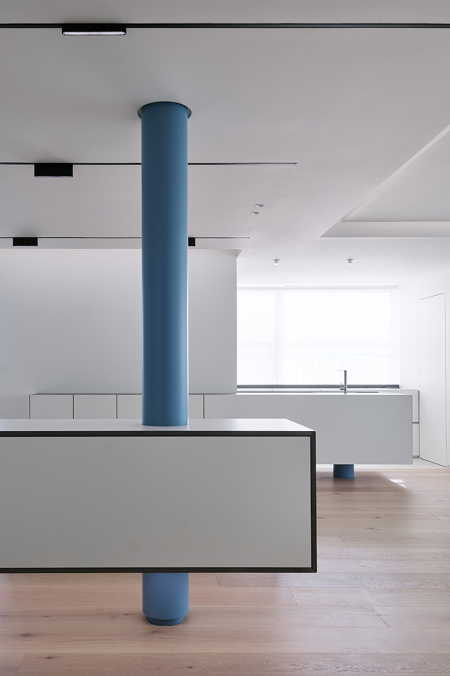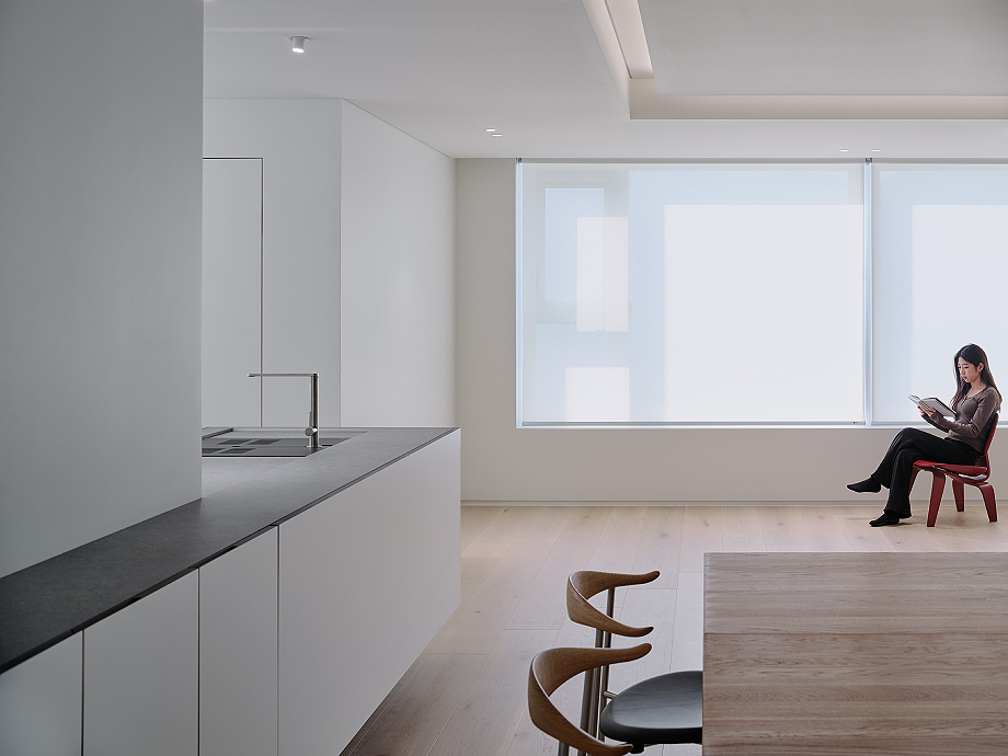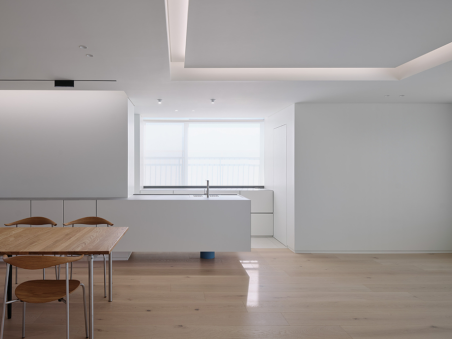 En el apartamento, de 163 m² y ubicado en Daegu (Corea del Sur), se eliminaron deliberadamente los elementos decorativos, permitiendo que prevaleciesen los elementos arquitectónicos más fundamentales: la línea y el volumen. El diseño no busca un impacto visual inmediato, sino que pone el foco en la proporción, la claridad y el carácter inherente de los materiales y la estructura. En el centro de esta composición, se alza una única columna en color azul, introducida con intención, que organiza y equilibra el espacio, convirtiéndose en un punto focal de la escena.