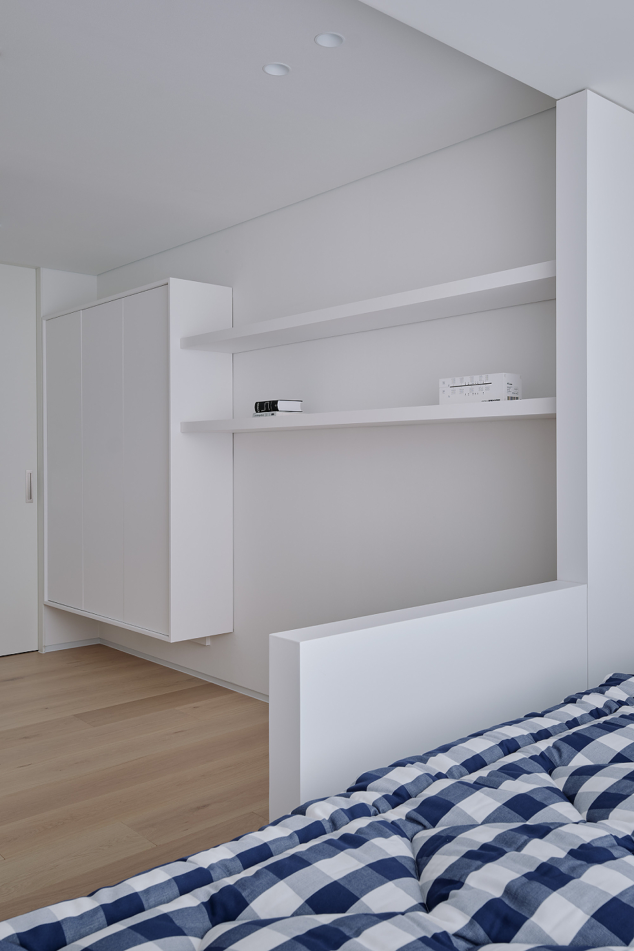 Diseñada por Super Pie Design Studio, la firma fundada por Jaewoo Park, esta vivienda es una exploración del minimalismo aplicado a la vida doméstica contemporánea con sobriedad y precisión. “El minimalismo aspira a la simplicidad, pero nunca está vacío. El orden, la tensión y la serena densidad emocional que un espacio transmite sin palabras emergen con mayor claridad cuando se eliminan los ornamentos y se revela la esencia”, explica el autor del proyecto. En el espacio, destaca la columna azul que se convierte en el protagonista de un ambiente neutro tejido con el color blanco y la cálida madera.