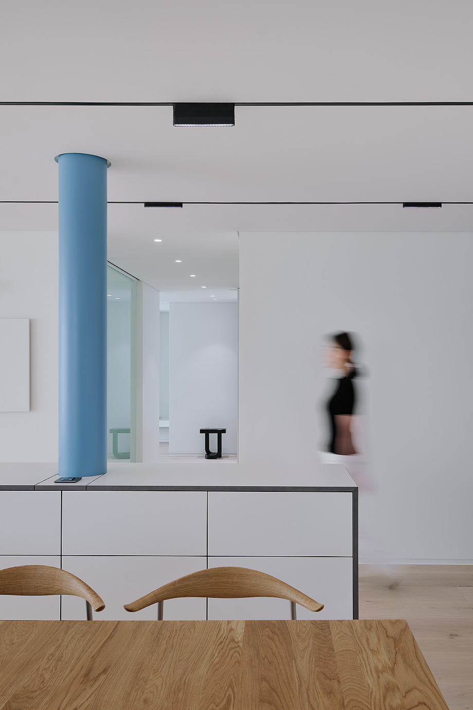 En definitiva, concluye el diseñador, la casa «no es simplemente el interior de un apartamento minimalista, es un espacio continuo, donde la estructura, la vida cotidiana y los objetos convergen gradualmente con el tiempo. Es una vivienda que se completa a través de la vida, un espacio intencionalmente inacabado anclado por las líneas refinadas, los vacíos medidos y la silenciosa presencia de una columna azul.»