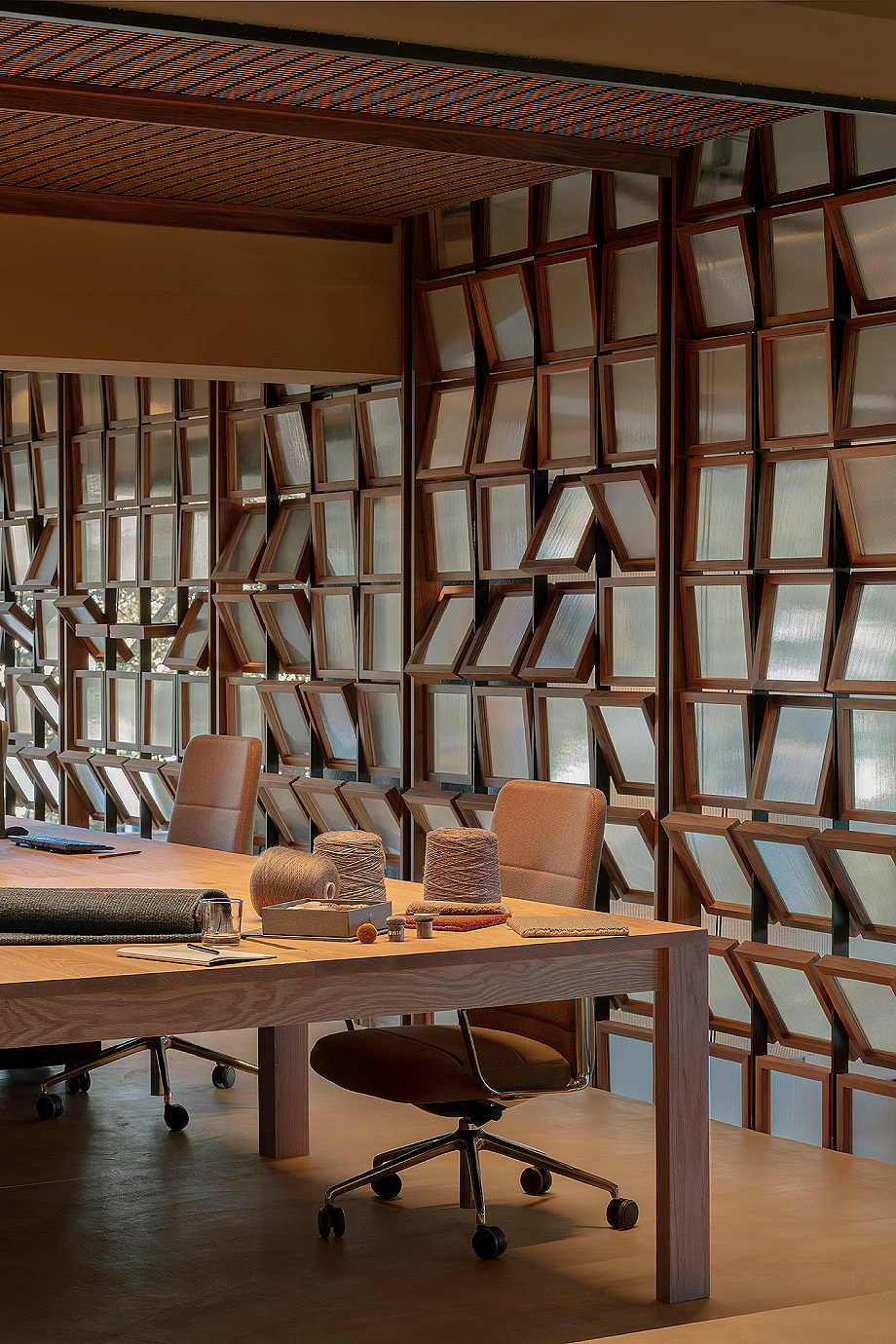 Presidiendo el espacio, una imponente celosía de seis metros de altura, realizada en nogal y cristal estriado por Fusteria Vidal, actúa como elemento vertebrador. Además de aportar privacidad a las oficinas, funciona como telón de fondo para las alfombras suspendidas, reforzando su presencia escénica.