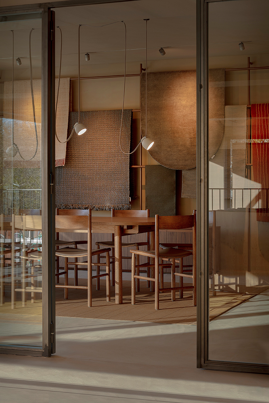 El mobiliario, cuidadosamente seleccionado, combina piezas de Nikari y Woodnotes -marcas nórdicas representadas por Cumellas- con diseños de Mobles 114, Muuto, &Tradition, Vibia y Santa & Cole. Esta cuidada selección complementa el carácter exclusivo de las alfombras y permite crear ambientes realistas orientados a proyectos de interiorismo. La iluminación, firmada por Viabizzuno, subraya los colores y matices de los tejidos y contribuye decisivamente a generar una atmósfera cálida y acogedora.