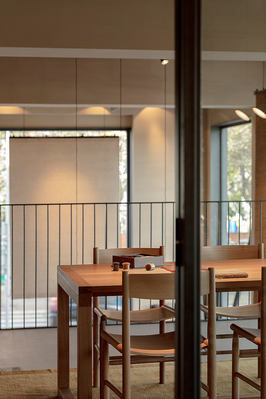 El derribo parcial del primer forjado permitió generar el espacio a doble altura que aporta amplitud y continuidad visual. Al mismo tiempo, la apertura de la fachada mediante grandes ventanales convirtió el interior en un escaparate vivo que invita a los transeúntes a descubrir el espacio, otorgando a las alfombras un papel claramente protagonista. Éstas se exhiben mediante un sistema de poleas inspirado en las tramoyas teatrales, una solución práctica y flexible que facilita la renovación de la exposición.