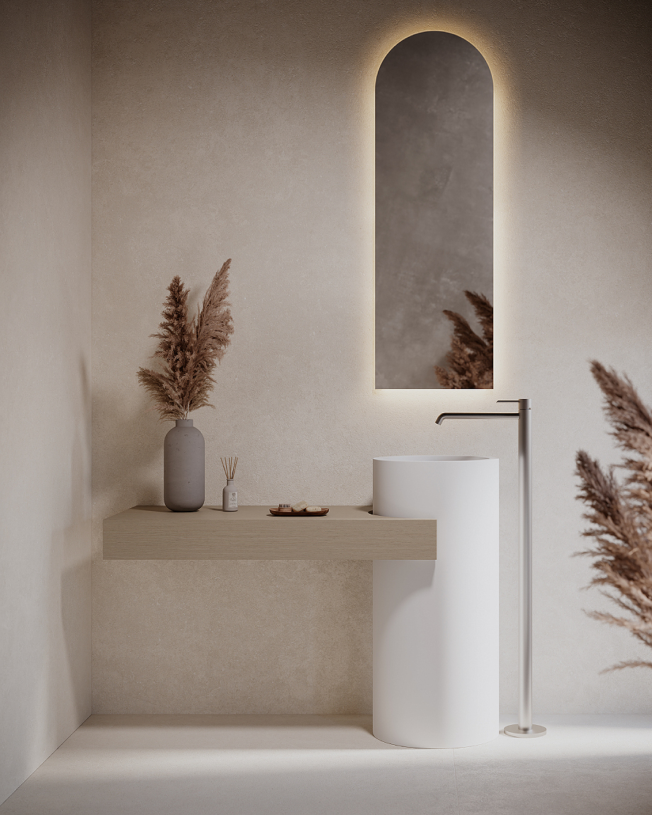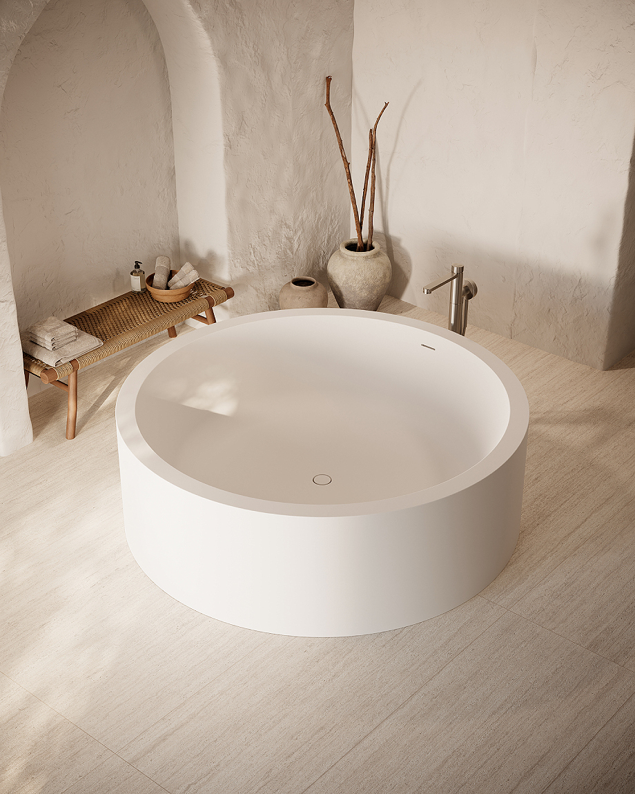 Entre las piezas que forman la serie, sobresale la bañera redonda de gran formato (Ø 140 cm), una pieza escultórica de fuerte presencia que invita al descanso y a la reconexión con lo esencial. Eclipse incluye, además, tres modelos de lavabos: uno de suelo y dos sobre encimera (on top), todos disponibles en ambos acabados. Estos elementos se integran de manera armoniosa en cualquier espacio, aportando funcionalidad sin perder la estética que define a la colección.