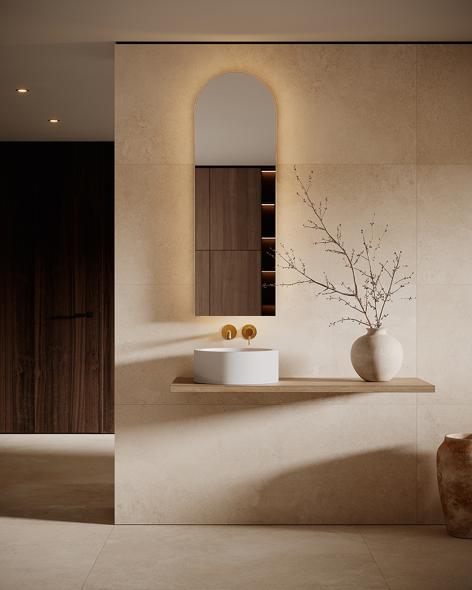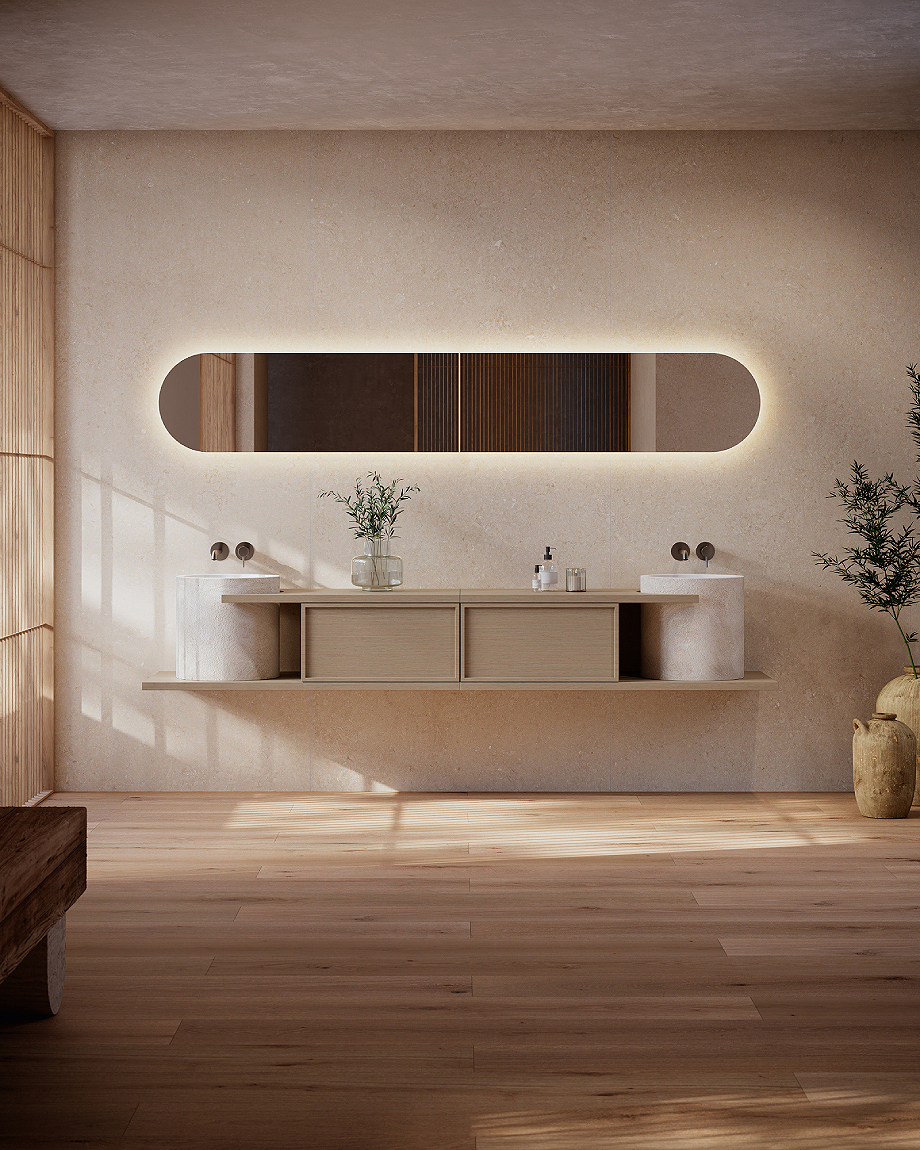 La propuesta se completa con muebles en tonalidad Breeze Oak, que generan contraste y calidez, y espejos sin marco con luz perimetral integrada, funcionales y adaptables a diferentes configuraciones y necesidades.