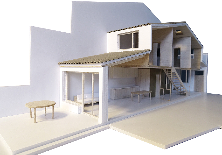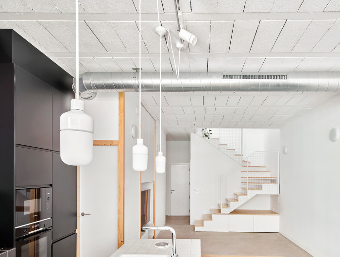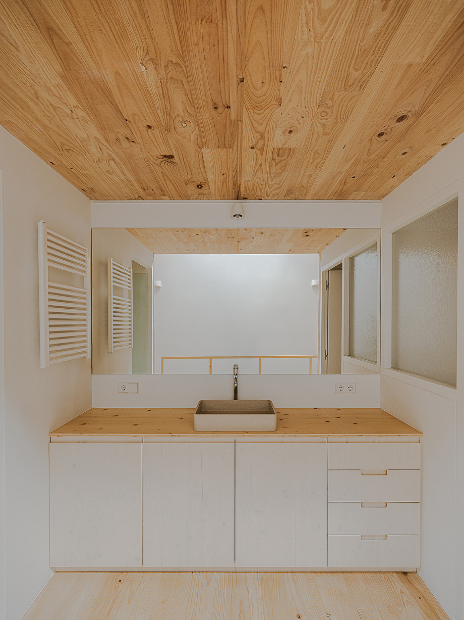 La nueva vivienda se organiza en dos niveles. En la planta baja, un único espacio de cocina-estar-comedor se abre al patio. El lugar que normalmente ocuparía un coche se destinó a un recibidor con aparcamiento para bicicletas, lavadero y almacenamiento. En el centro de la casa, un baño y una escalera completamente abierta favorecen la entrada de luz natural y la conexión visual entre todas las estancias. El primer piso alberga el dormitorio, un estudio y un baño abierto a la escalera. La vivienda está diseñada para cubrir únicamente lo necesario, eliminando espacios y habitaciones superfluos.