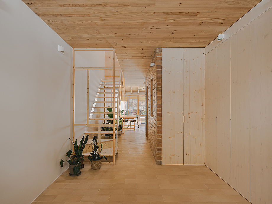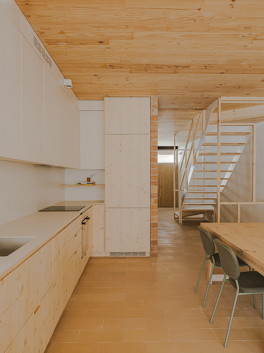 Se prescindió de falsos techos y revestimientos innecesarios, apostando por materiales naturales y sostenibles: la estructura, las ventanas, las persianas, el mobiliario y las puertas son de madera; el aislamiento es de fibra de madera; y las fachadas se revisten con paneles de corcho. En la planta superior, la madera vista aporta calidez a los interiores. En la planta baja, el pavimento de baldosa cerámica de El Bruc y el muro de ladrillo del Segrià aportan frescor, conformando una selección de materiales que ayuda a regular los cambios de temperatura y humedad de la vivienda.