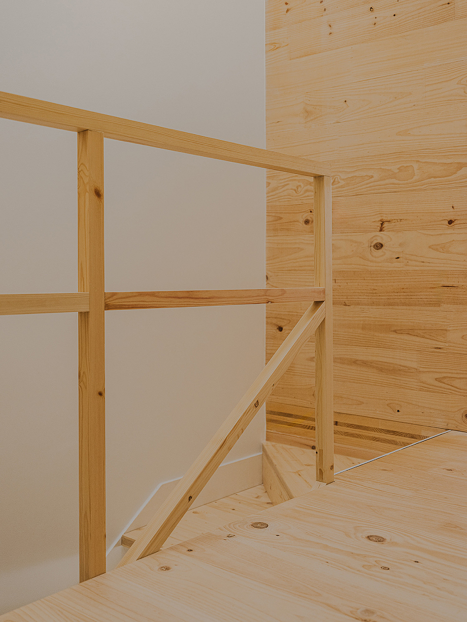 La planta primera funciona como una caja cerrada de madera contralaminada (CLT) apoyada sobre las medianeras existentes. Las dos cubiertas de la planta baja se resolvieron con vigas y entablados de madera, apoyando entre la caja superior y las fachadas. La fachada de la calle se restauró, recuperando la fisonomía original de la vivienda.