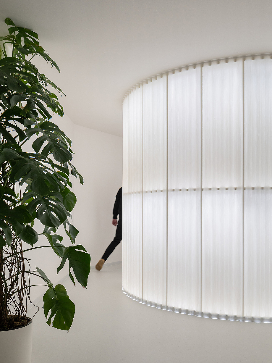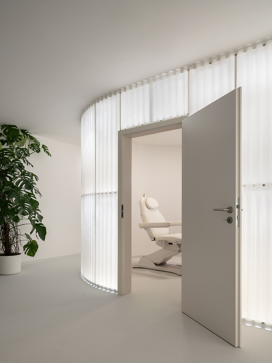 Siguiendo con la metáfora teatral, se recurrió a un juego de luces y sombras que se despliega en todo el interior, animado por mamparas de fibra de vidrio retroiluminadas y por la luz de trabajo de cada estación, que actúa como foco para las “estrellas” del espectáculo. La iluminación se convierte en material y medio, modulando el espacio y diluyendo sus dimensiones reales.