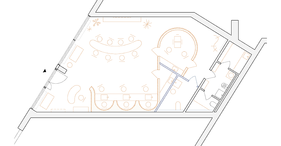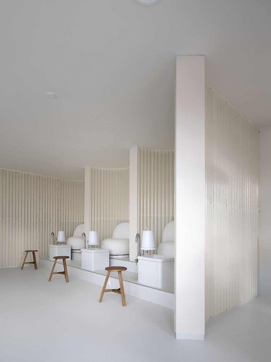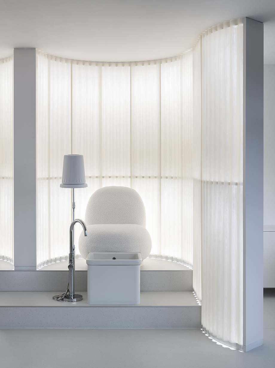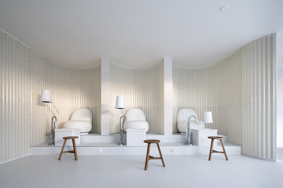 El diseño sitúa al cliente en el centro, buscando ofrecerle una experiencia diferenciada que se aleje de lo ordinario. Los autores del proyecto dieron forma tanto al escenario como a los elementos que forman parte de él: desde la recepción hasta los baños y el backstage, ocultos tras un volumen curvo que alberga una sala para clientes que buscan mayor privacidad, pasando por la larga mesa de manicura y las butacas elevadas para la pedicura. «Cada forma y capa espacial está diseñada para sumergir al visitante en el teatro del salón», apuntan.