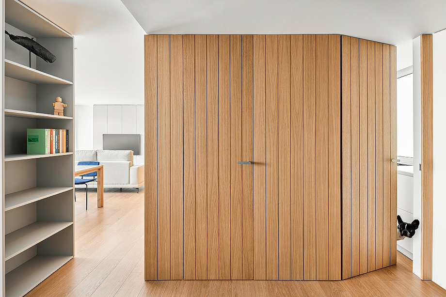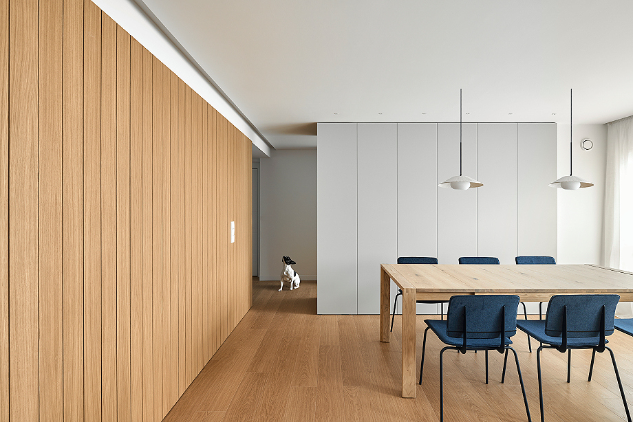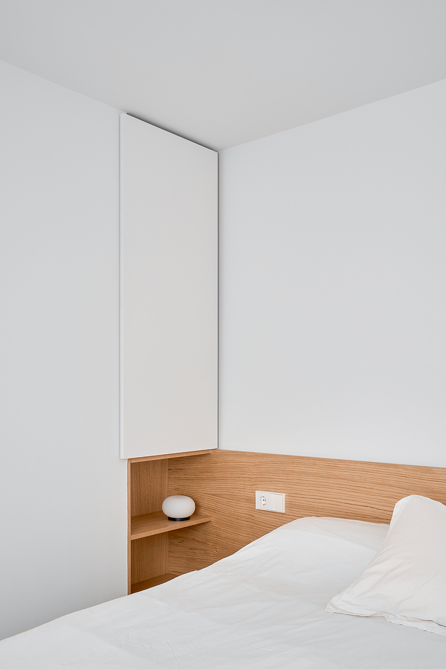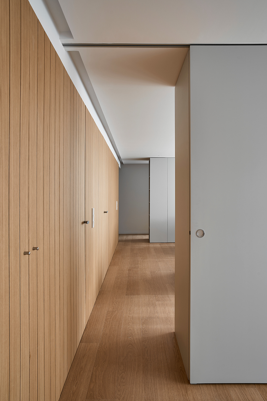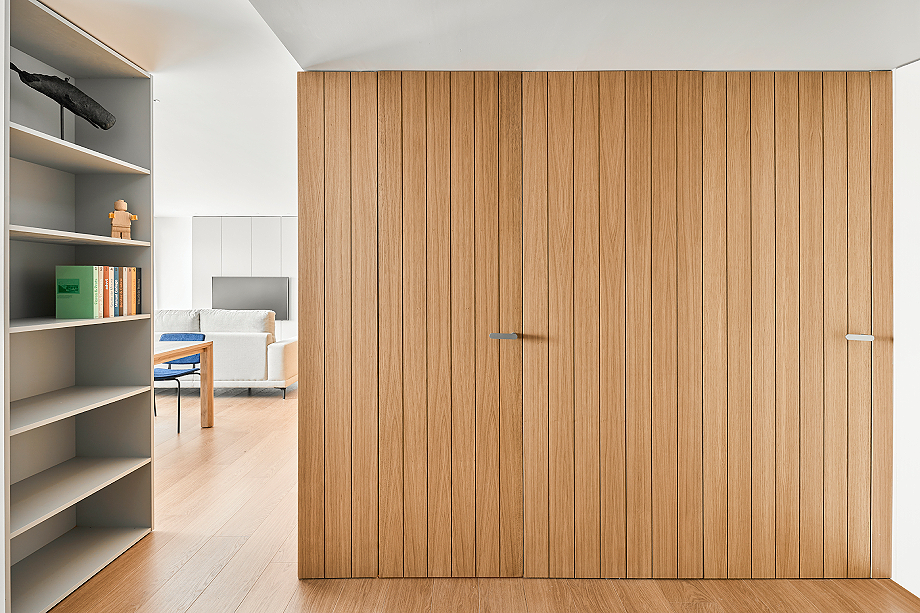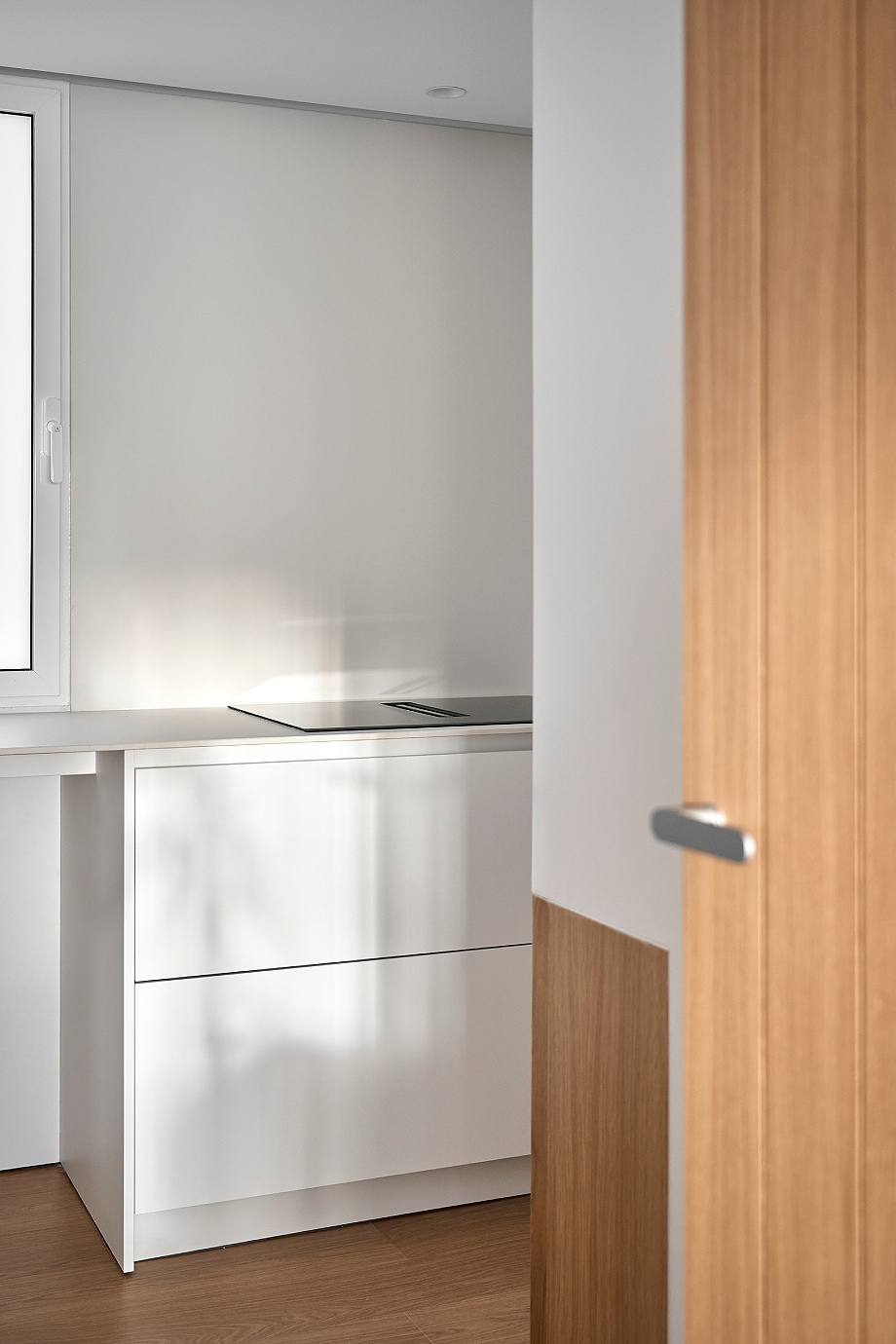 Los espacios servidores se concentran en un volumen compacto revestido con lamas de madera de roble, que funciona como telón de fondo de las zonas de día y aporta densidad al conjunto doméstico. En su interior, se alojan la cocina y los cuartos húmedos, articulados a través de una doble circulación que incrementa la funcionalidad y enriquece los recorridos de la vivienda. Esta disposición permite además la ventilación cruzada y el filtrado de la luz procedente del patio de manzana. El acceso al dormitorio principal, situado en el ámbito más privado de la casa, se produce atravesando los espacios de vestidor y aseo, también integrados en este volumen.