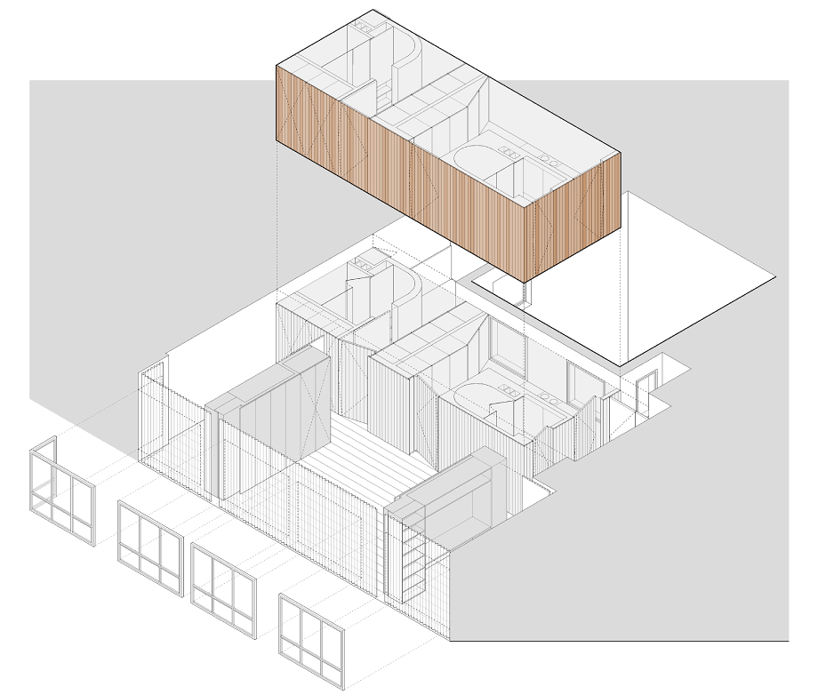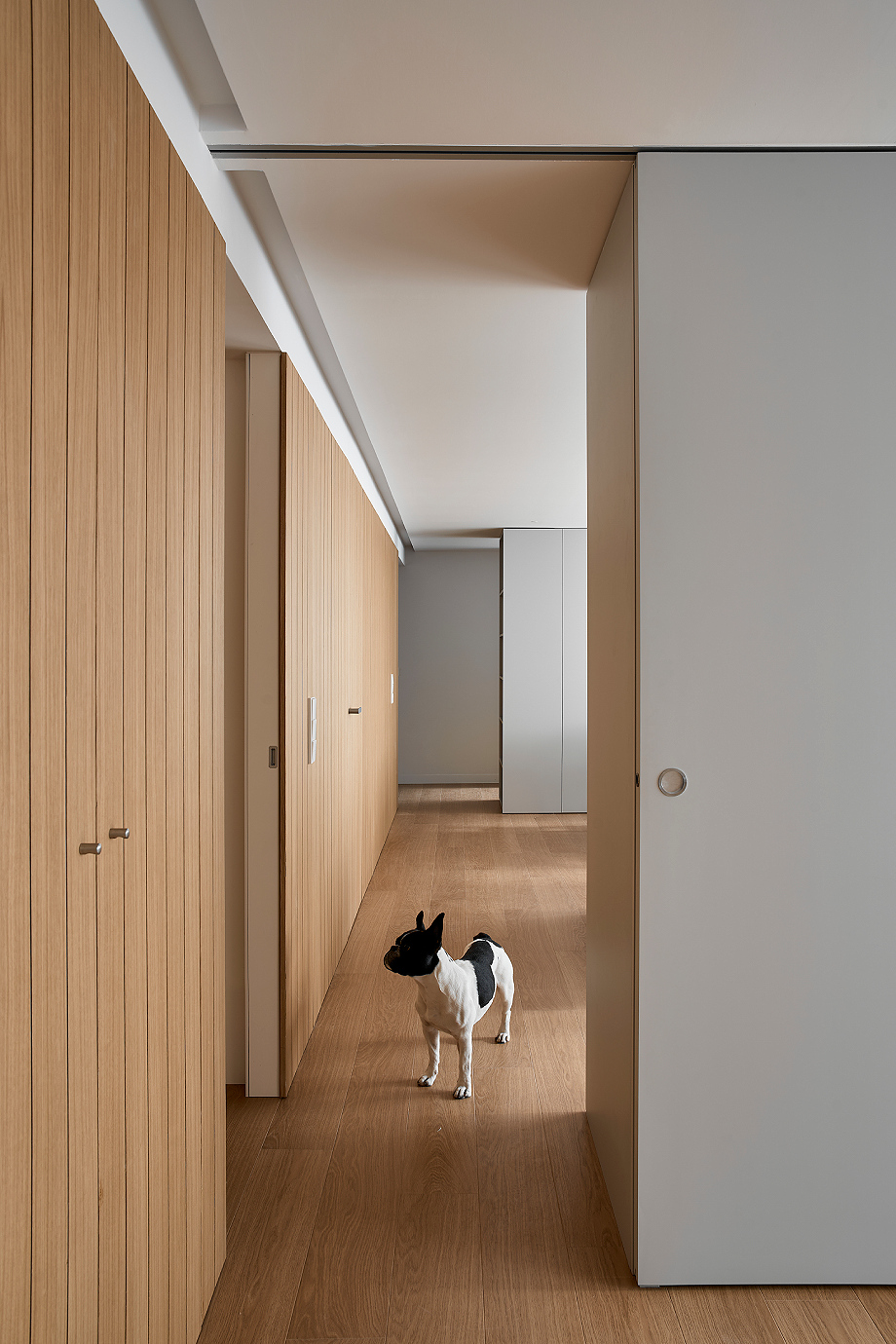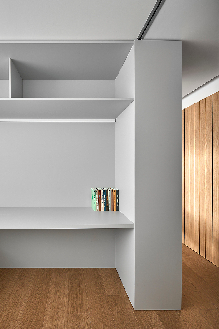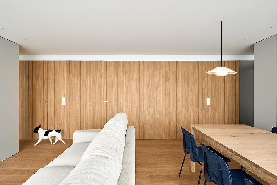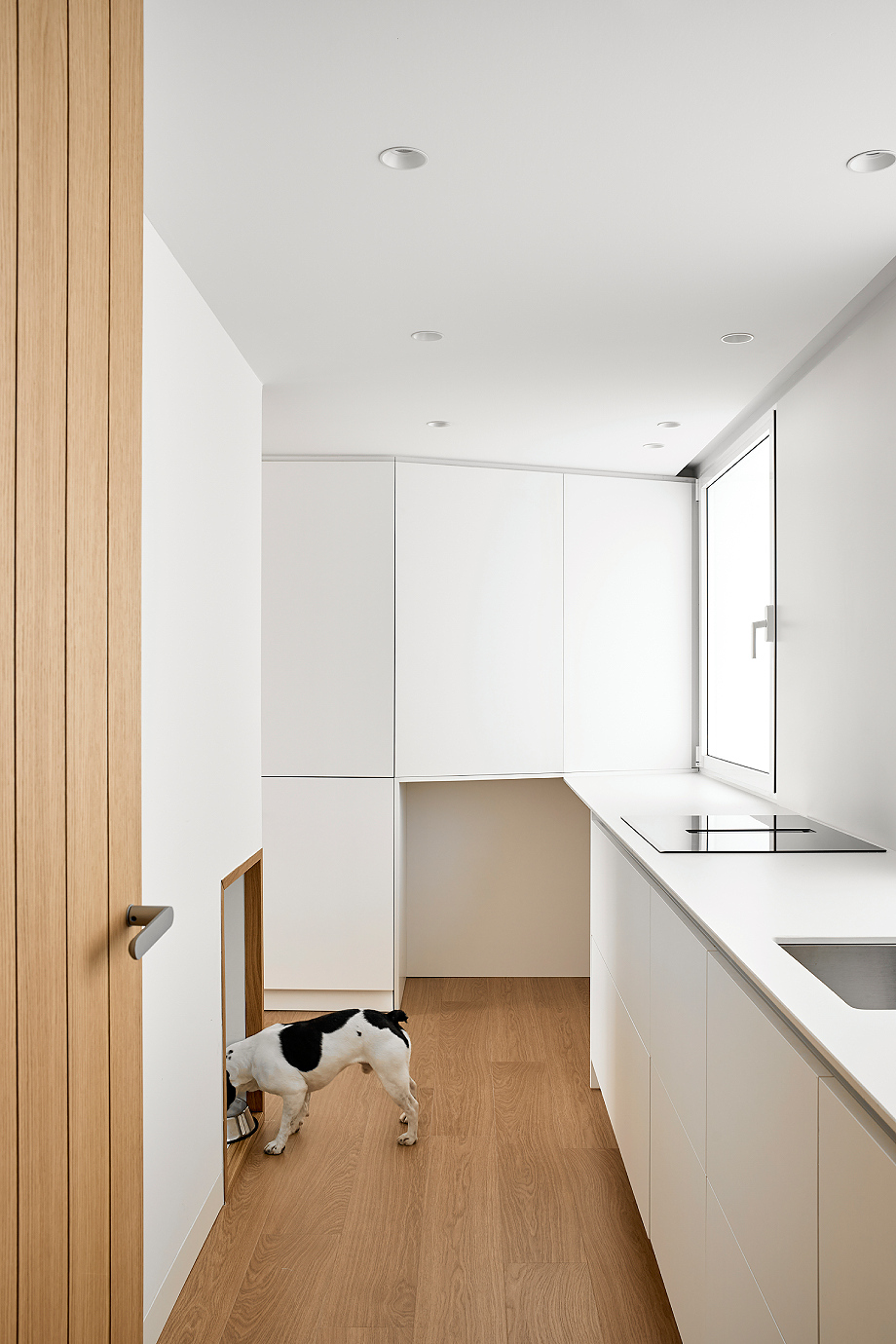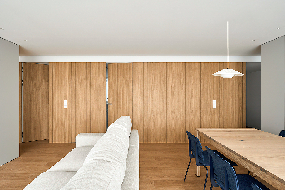 Los espacios servidores se concentran en un volumen compacto revestido con lamas de madera de roble, que funciona como telón de fondo de las zonas de día y aporta densidad al conjunto doméstico. En su interior, se alojan la cocina y los cuartos húmedos, articulados a través de una doble circulación que incrementa la funcionalidad y enriquece los recorridos de la vivienda. Esta disposición permite además la ventilación cruzada y el filtrado de la luz procedente del patio de manzana. El acceso al dormitorio principal, situado en el ámbito más privado de la casa, se produce atravesando los espacios de vestidor y aseo, también integrados en este volumen.