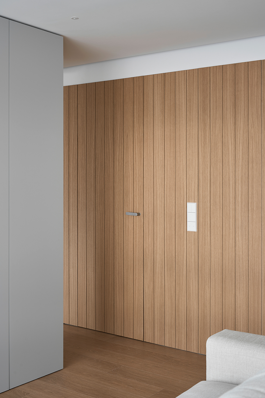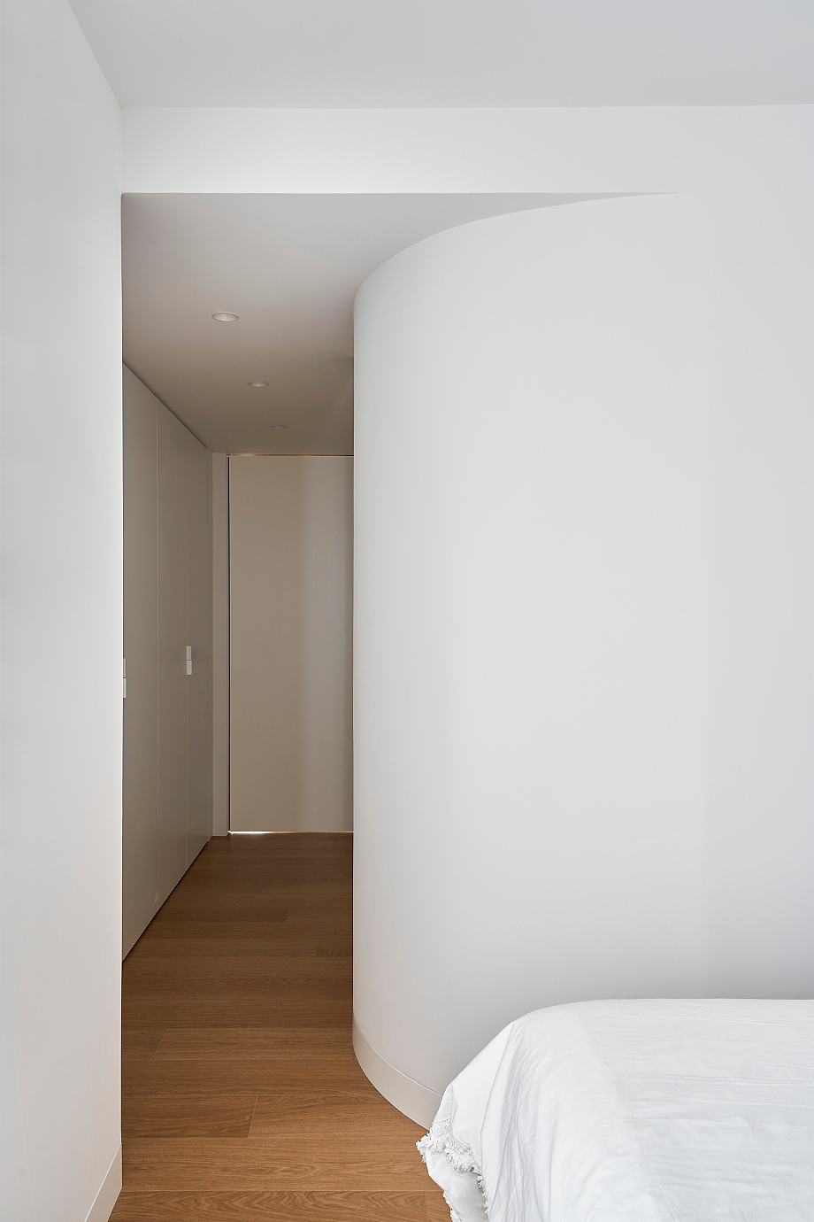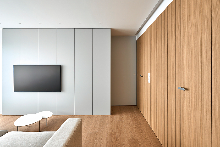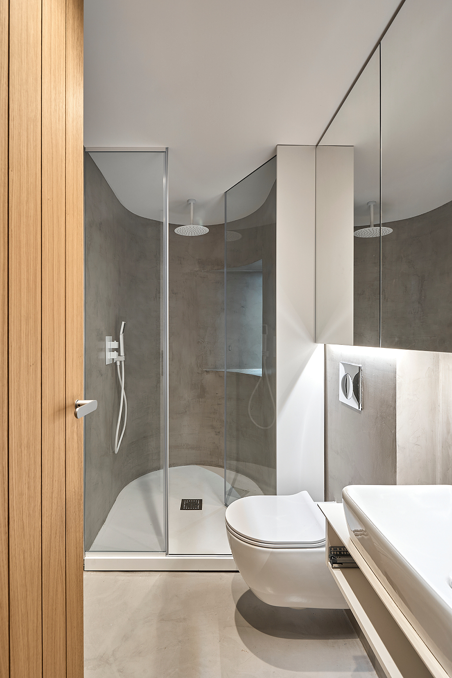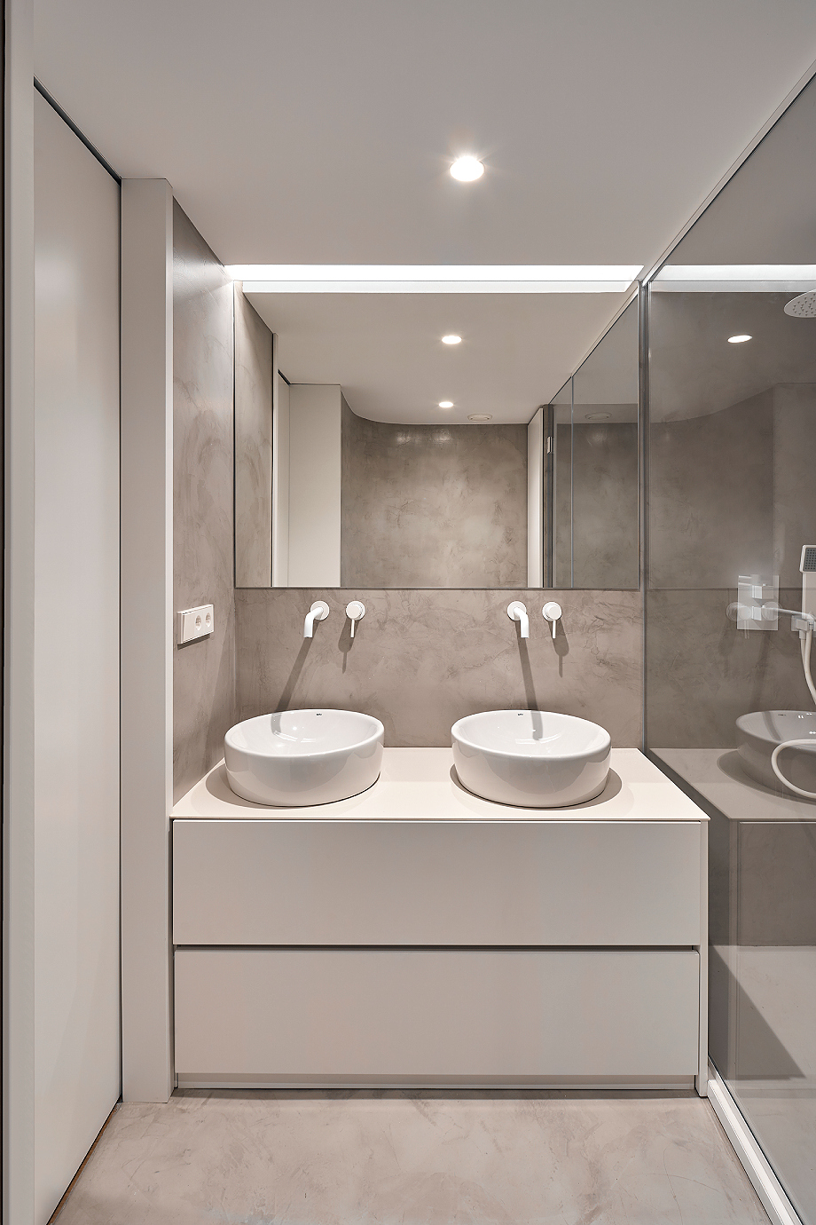 La materialidad de la intervención investiga las distintas aplicaciones y texturas de la madera de roble en contraste con el blanco de los textiles y el gris de los muebles funcionales. La madera introduce calidez y color, proporcionando confort doméstico al usuario. En los cuartos húmedos, la geometría se desmarca del resto de la vivienda mediante la introducción de la curva en un universo dominado por la línea recta. Esta variación formal se unifica a través de un acabado continuo de microcemento, que refuerza la coherencia material y espacial del proyecto.