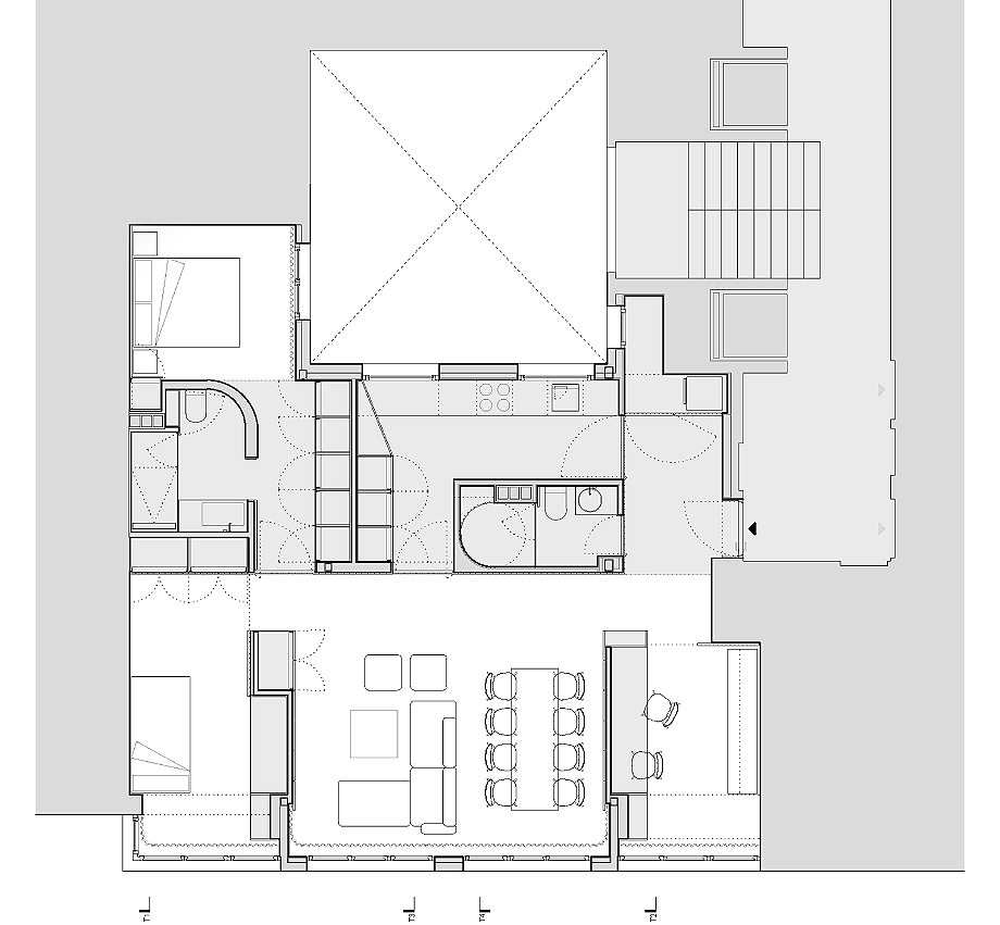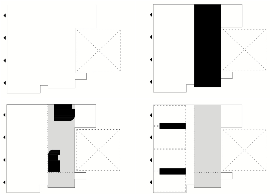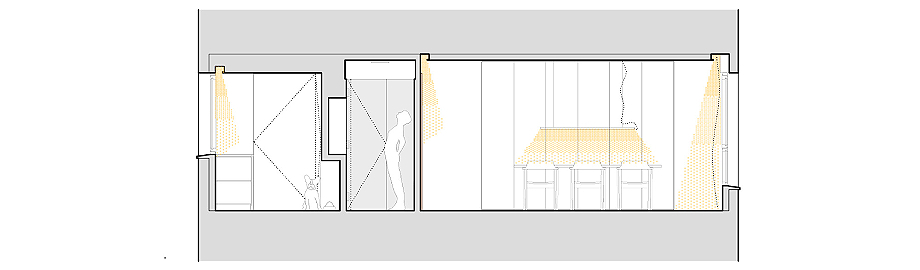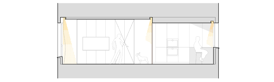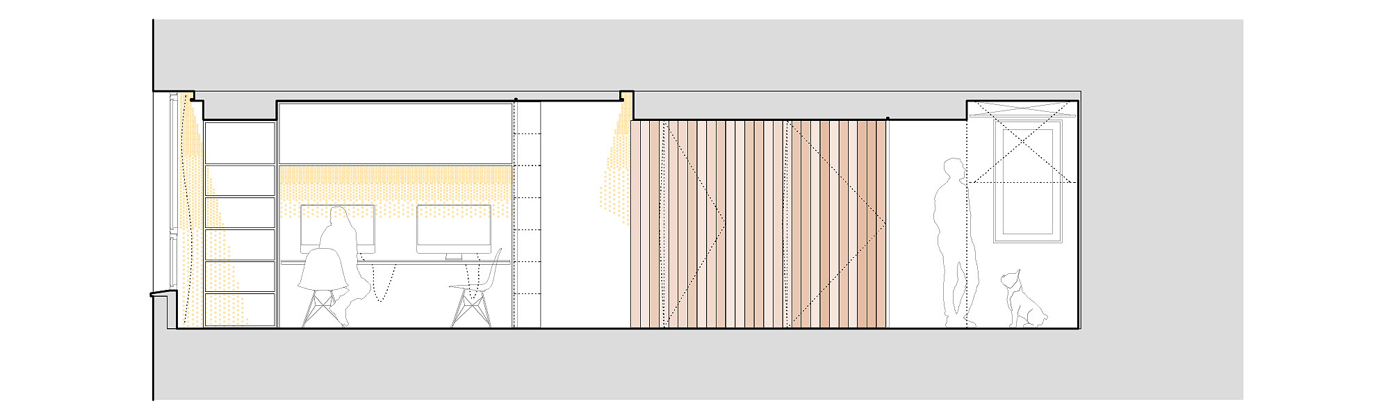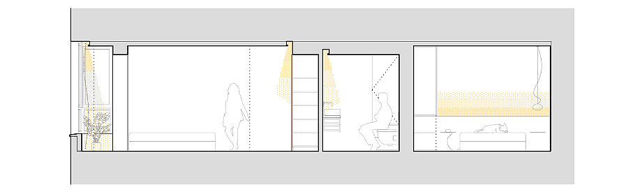 La nueva distribución permite que la casa se abra a la ciudad mediante cuatro espacios virtuales de fachada. El salón ocupa el doble espacio central y actúa como pieza principal, flanqueado por dos estancias gemelas de carácter flexible y uso intercambiable: estudio, dormitorio, biblioteca o zona de relax. Estos ámbitos se delimitan mediante dos muebles grises que contrastan con el blanco predominante del espacio, potenciando la entrada de la luz natural de poniente. Ambos elementos integran el almacenamiento y las instalaciones necesarias para los espacios contiguos.