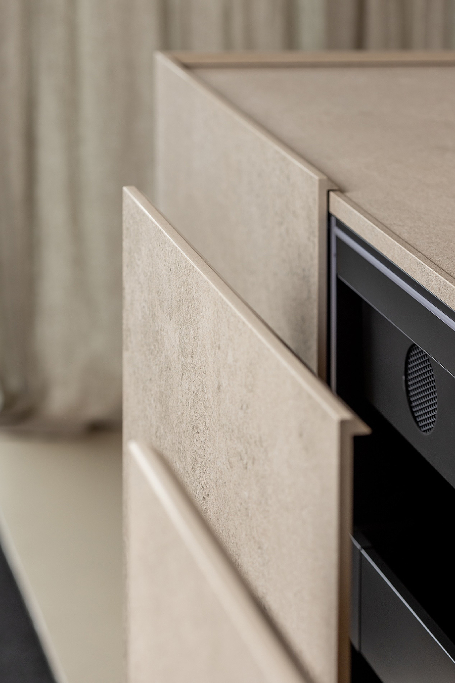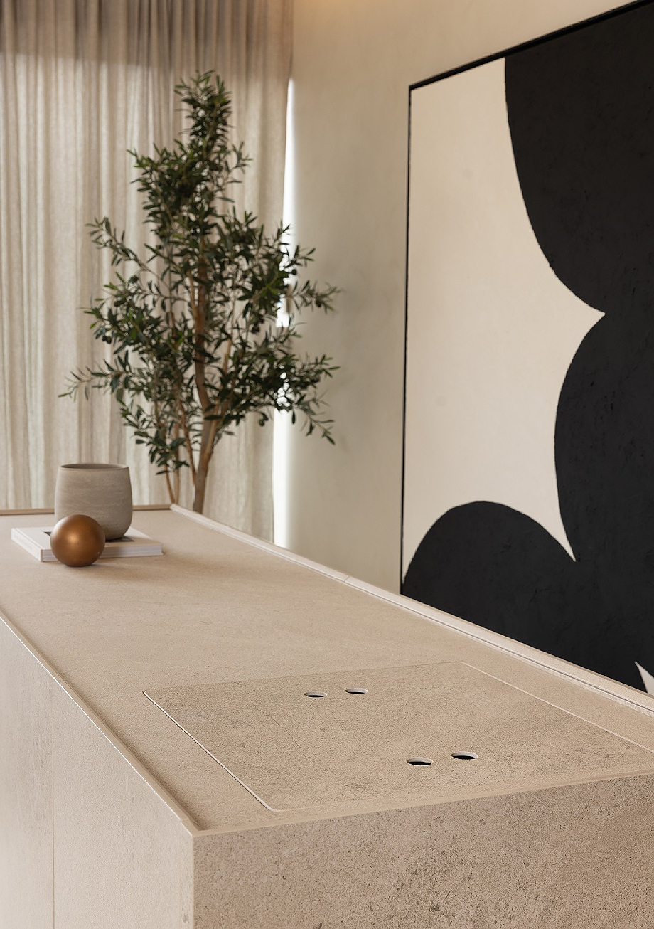 La tecnología queda integrada de manera discreta, casi imperceptible, para mantener la pureza formal del conjunto. El sistema de inducción invisible, sin necesidad de disipador térmico, permite utilizar una única superficie continua para cocinar, preparar y presentar los alimentos. A su vez, la zona de aguas, tallada íntegramente en MDi y concebida para poder ocultarse, potencia la flexibilidad del diseño y su adaptación a diferentes situaciones de uso.