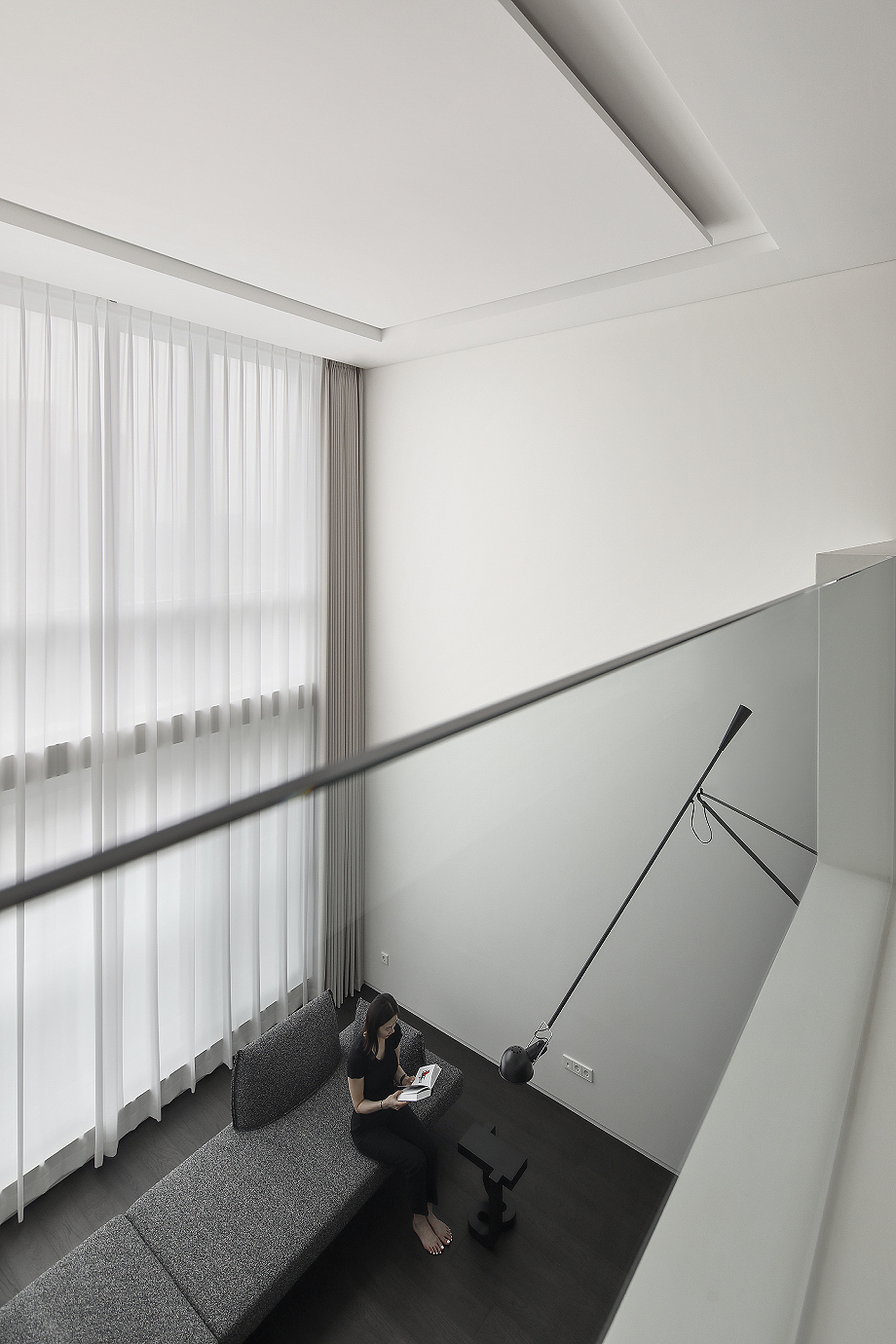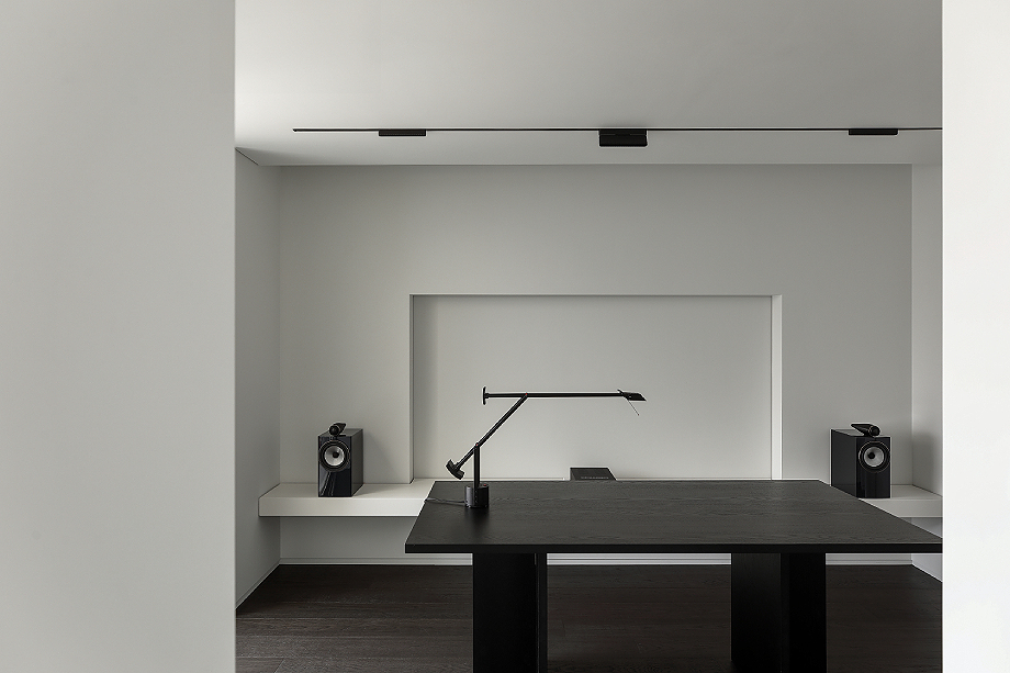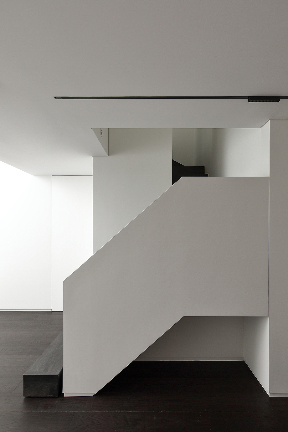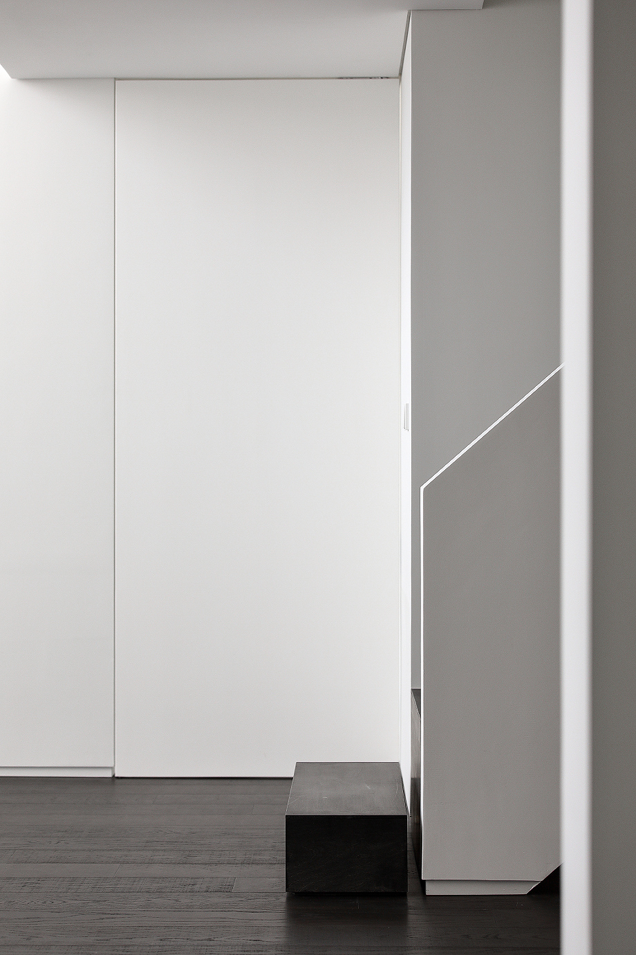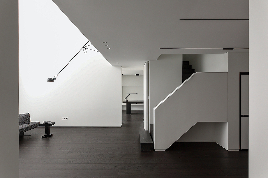 La sala de estar es un espacio a doble altura, abierto y proporcionado, donde la simplicidad y el vacío se combinan para expresar la verdadera esencia del minimalismo. En esta estancia, una pequeña y empinada escalera cobra protagonismo: no solo funciona como elemento de circulación sino como un conector escultórico y volumétrico que une las diferentes plantas. Sutil pero contundente, establece un orden rítmico dentro del entorno monocromático, ampliando la percepción espacial y generando tanto eficiencia como riqueza volumétrica.