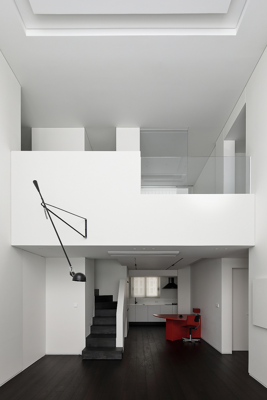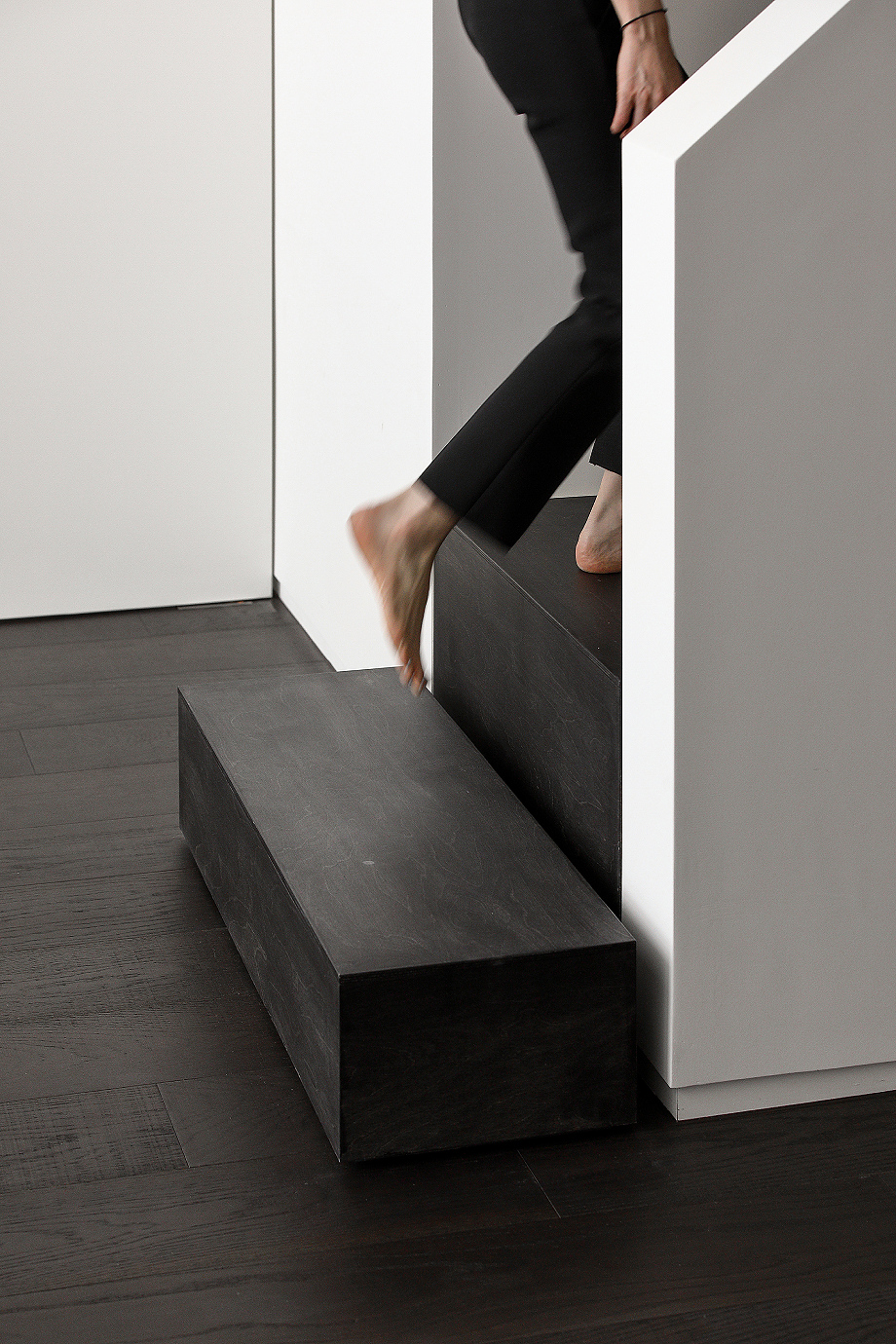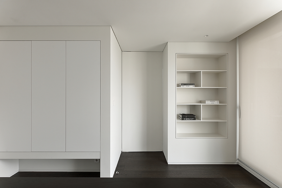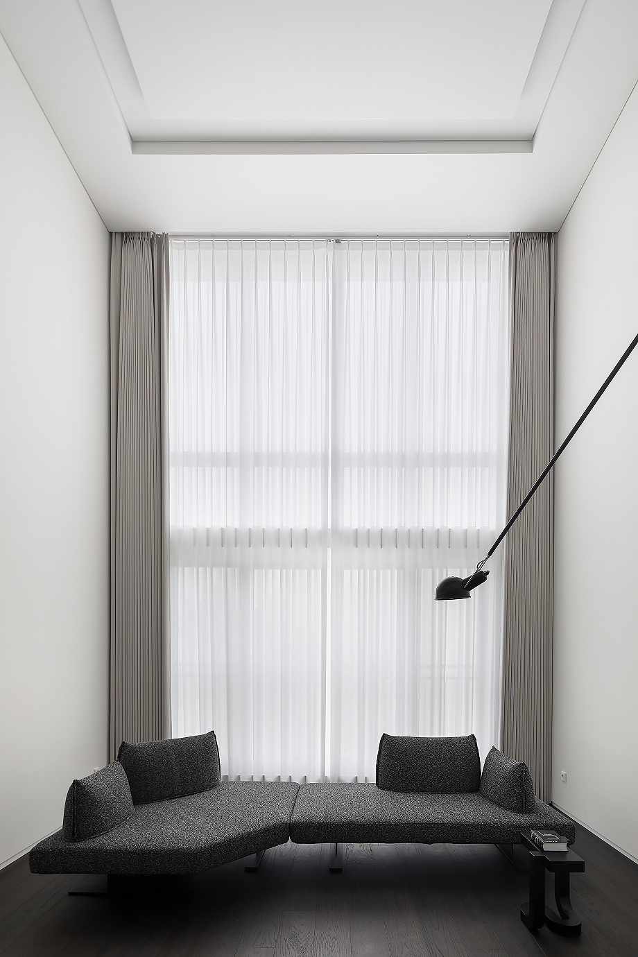 La sala de estar es un espacio a doble altura, abierto y proporcionado, donde la simplicidad y el vacío se combinan para expresar la verdadera esencia del minimalismo. En esta estancia, una pequeña y empinada escalera cobra protagonismo: no solo funciona como elemento de circulación sino como un conector escultórico y volumétrico que une las diferentes plantas. Sutil pero contundente, establece un orden rítmico dentro del entorno monocromático, ampliando la percepción espacial y generando tanto eficiencia como riqueza volumétrica.