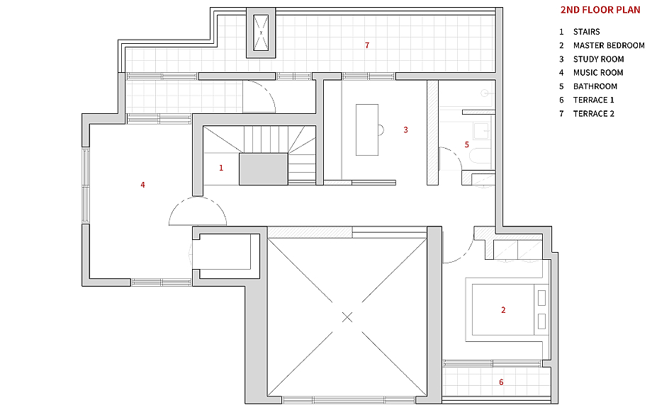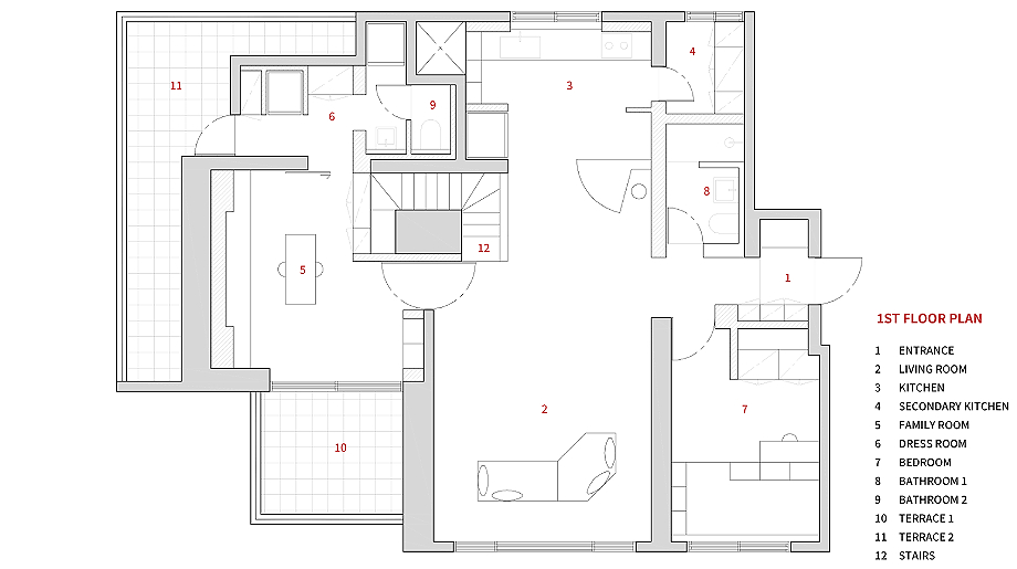 En el interior de la vivienda, una paleta cromática de blanco y negro remite a la profundidad y a la serena claridad de la pintura tradicional coreana con tinta, reinterpretada aquí en clave contemporánea. La directora creativa Jiyoung Yoon se encargó de aportar un toque final de refinamiento, introduciendo una delicada sobriedad tonal que permite que la tranquilidad se perciba como una presencia natural en todo el espacio. Un único punto de color, la mesa de comedor roja, actúa como ancla visual y aporta vitalidad sin romper la serenidad del entorno. Como una pincelada en un lienzo, transforma el espacio en un escenario vivo, equilibrando sobriedad e intensidad.