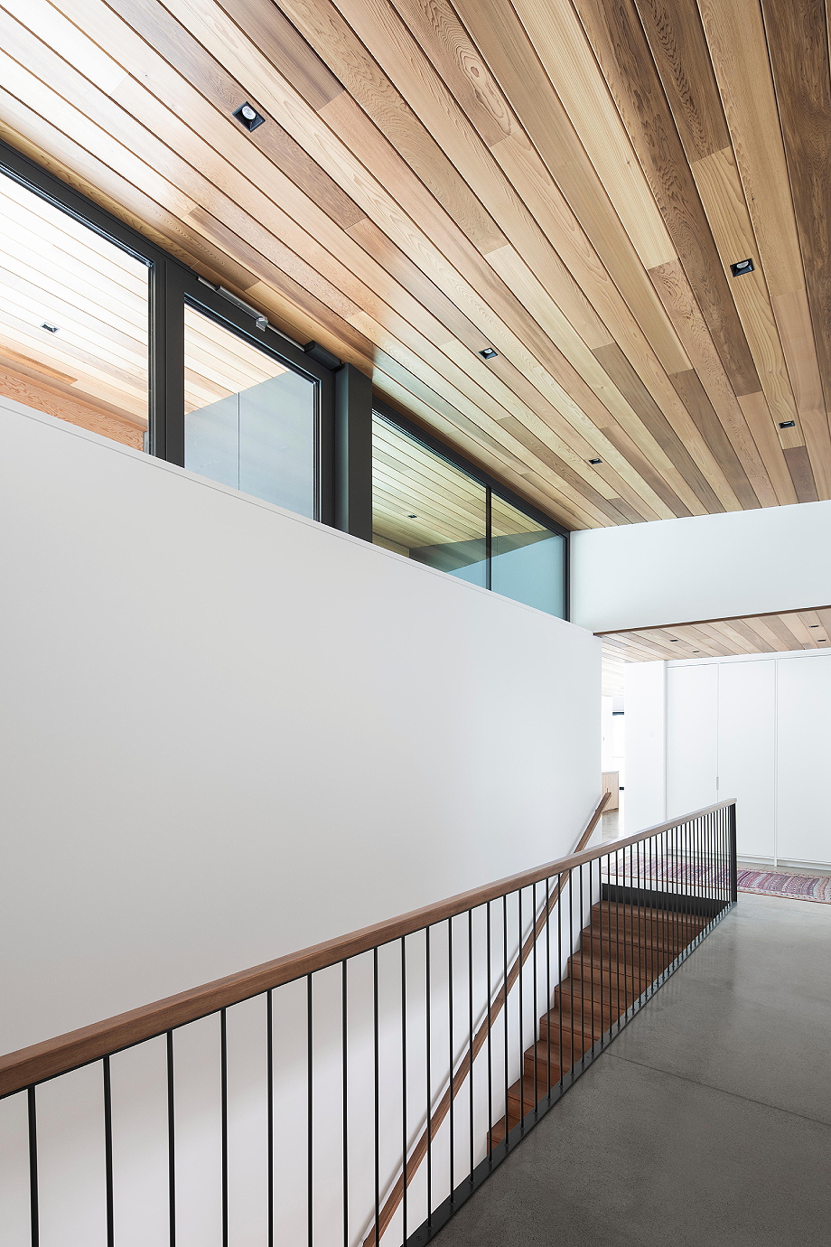 Los materiales elegidos para la casa son deliberadamente sobrios. Un techo continuo de cedro recorre los espacios principales y aporta una sensación de unidad y calidez, mientras que el mobiliario a medida en nogal refuerza la cohesión del interior y el cuidado en los detalles. En contraste, los suelos de hormigón pulido introducen una materialidad más neutra y resistente, equilibran la paleta y garantizan durabilidad en el uso cotidiano.