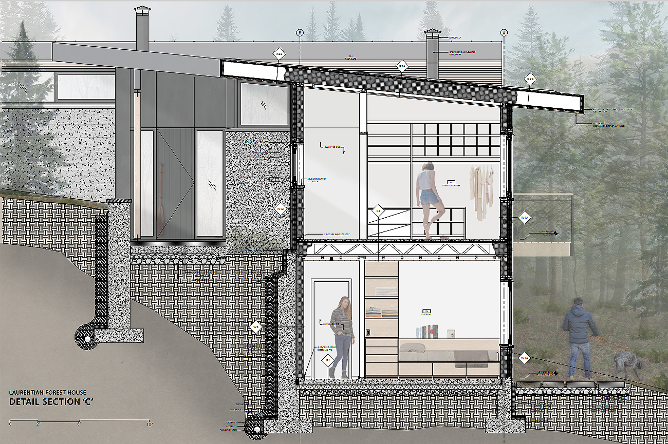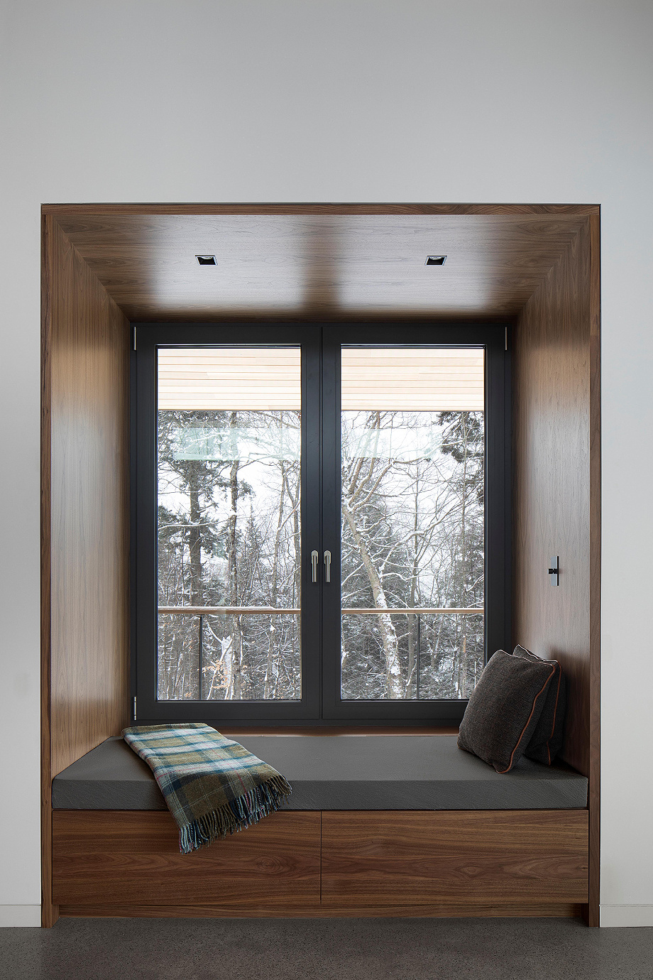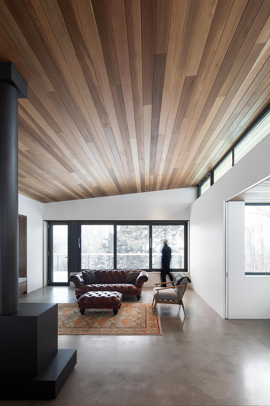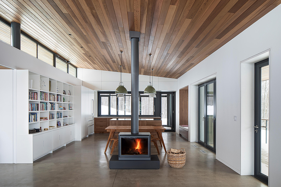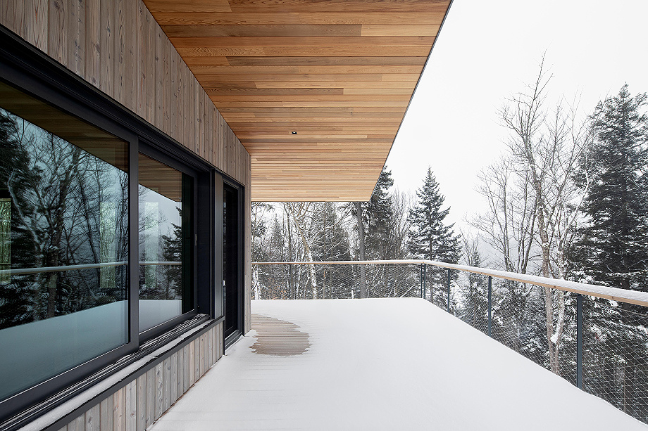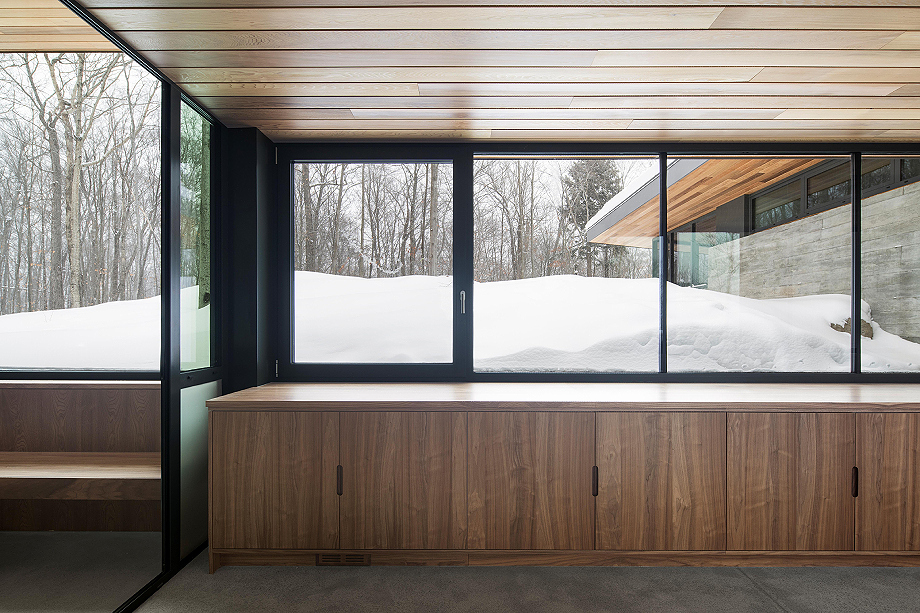 Durante muchos veranos, los hijos de los propietarios acamparon en la cima del terreno, creando un vínculo profundo y personal con la tierra. Este lazo hizo que, en lugar de construir la vivienda en ese punto elevado, se decidiera preservarlo como un lugar familiar y ubicar la casa por debajo y a su alrededor. Esta disposición permitió respetar los antiguos árboles y, al mismo tiempo, mantener las amplias vistas hacia el Lago Notre-Dame y las montañas Laurentianas circundantes. Cada habitación se abre al bosque, creando un refugio sereno y contemplativo, profundamente conectado con el entorno natural.