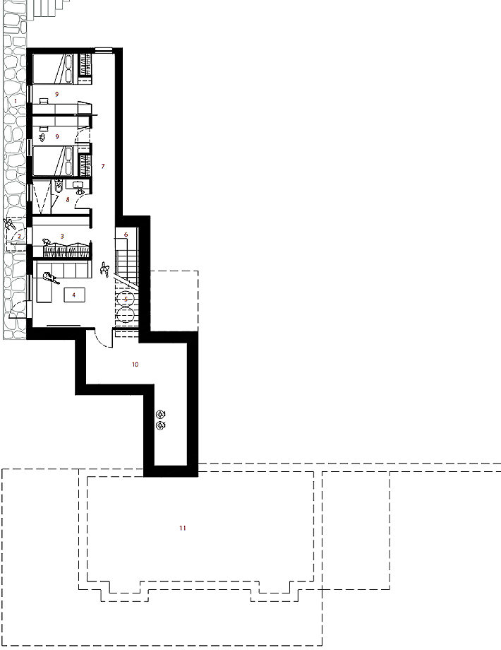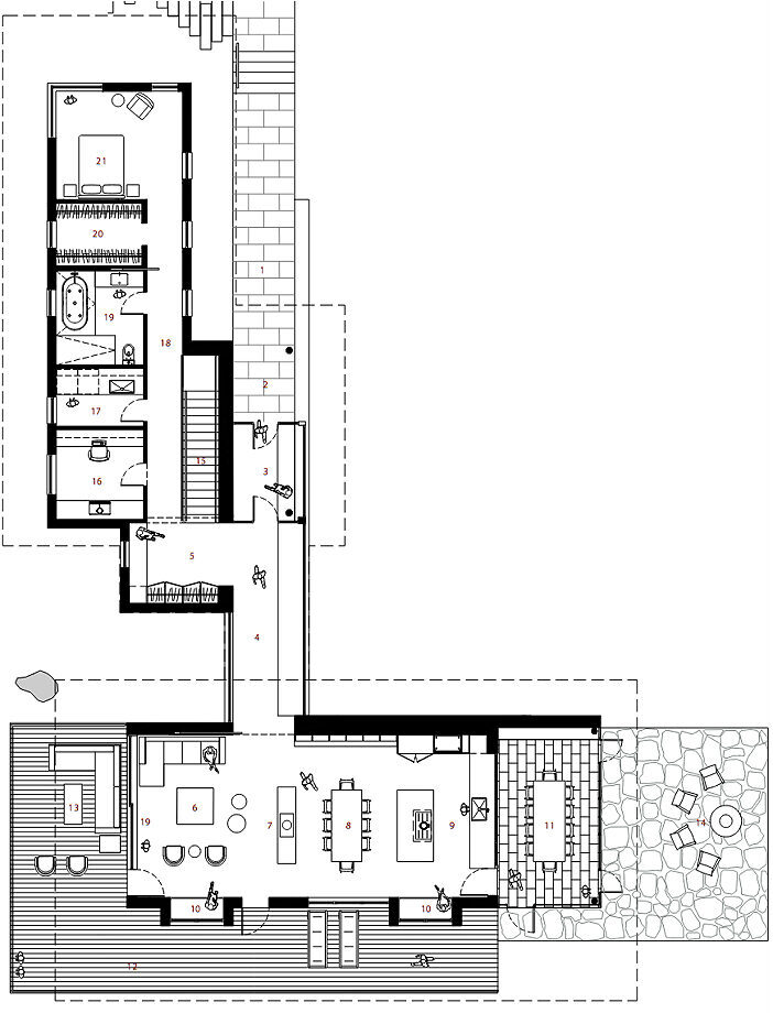 En el interior, la planta se organiza en un estar, ubicado en un volumen alargado orientado al sur, mientras que los dormitorios se disponen en un segundo volumen de dos plantas que se extiende hacia el oeste y el norte. El volumen con el estar es un espacio abierto que acoge el salón, el comedor y la cocina, complementado por un porche comedor con mosquitera. El volumen de descanso contiene tres habitaciones, dos baños, un estudio privado y una sala de estar en el nivel inferior con acceso y mudroom. Generosos aleros protegen la mayor parte de la casa y una amplia terraza de cedro prolonga los espacios de estar entre los árboles.