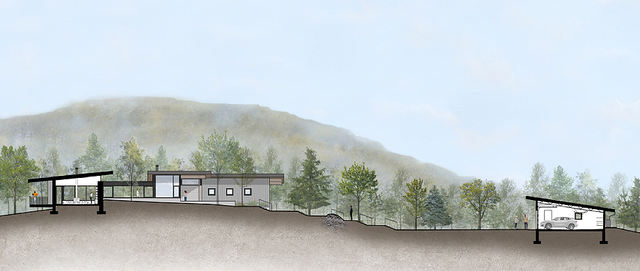 La forma en que se accede a la casa se convirtió en un elemento clave del diseño. Un camino serpenteante asciende suavemente a través del bosque, sumergiendo al visitante en el paisaje y acentuando la sensación de anticipación. Al llegar al estacionamiento, la casa se revela hacia el sur, mientras que un garaje independiente para dos vehículos marca el límite norte de la composición. Una escalera de piedra, integrada en el afloramiento rocoso natural del sitio, conduce a un paseo de entrada flanqueado por abedules y helechos autóctonos.