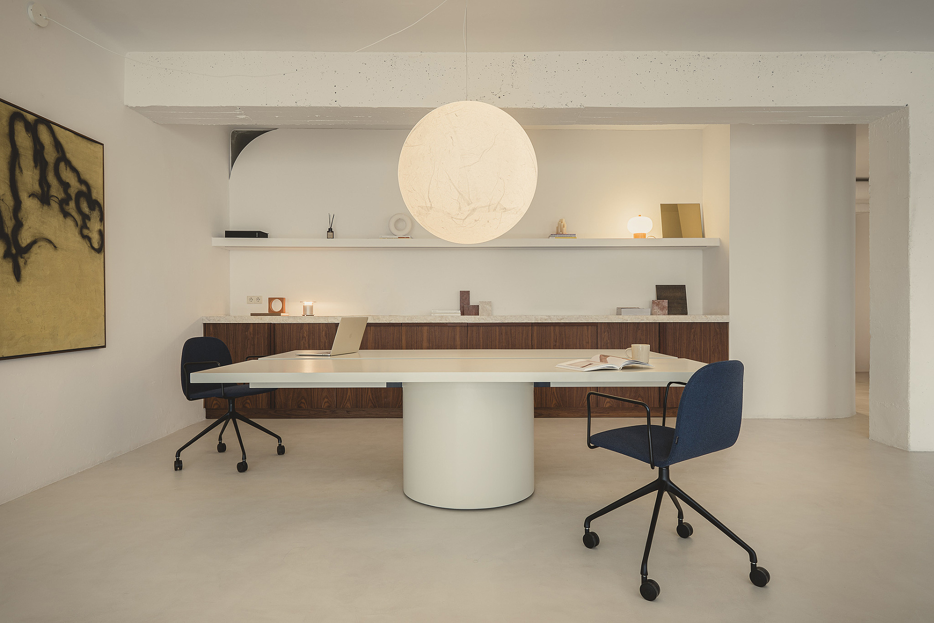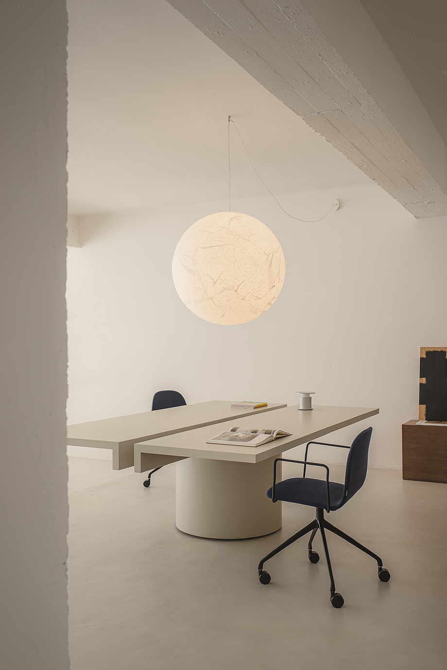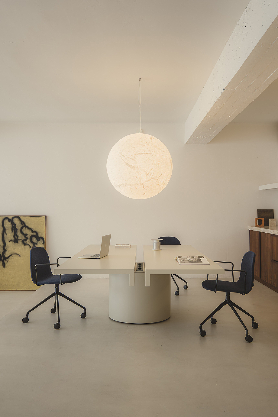 En acabados chapados en roble natural, nogal o lacado beige, Tot introduce calidez en entornos profesionales sin caer en el exceso decorativo. La madera dialoga con la geometría y la masa cilíndrica equilibra la ligereza del sobre suspendido. El resultado es una mesa operativa que reivindica la honestidad constructiva en el diseño contemporáneo y demuestra que la serenidad también puede ser audaz.