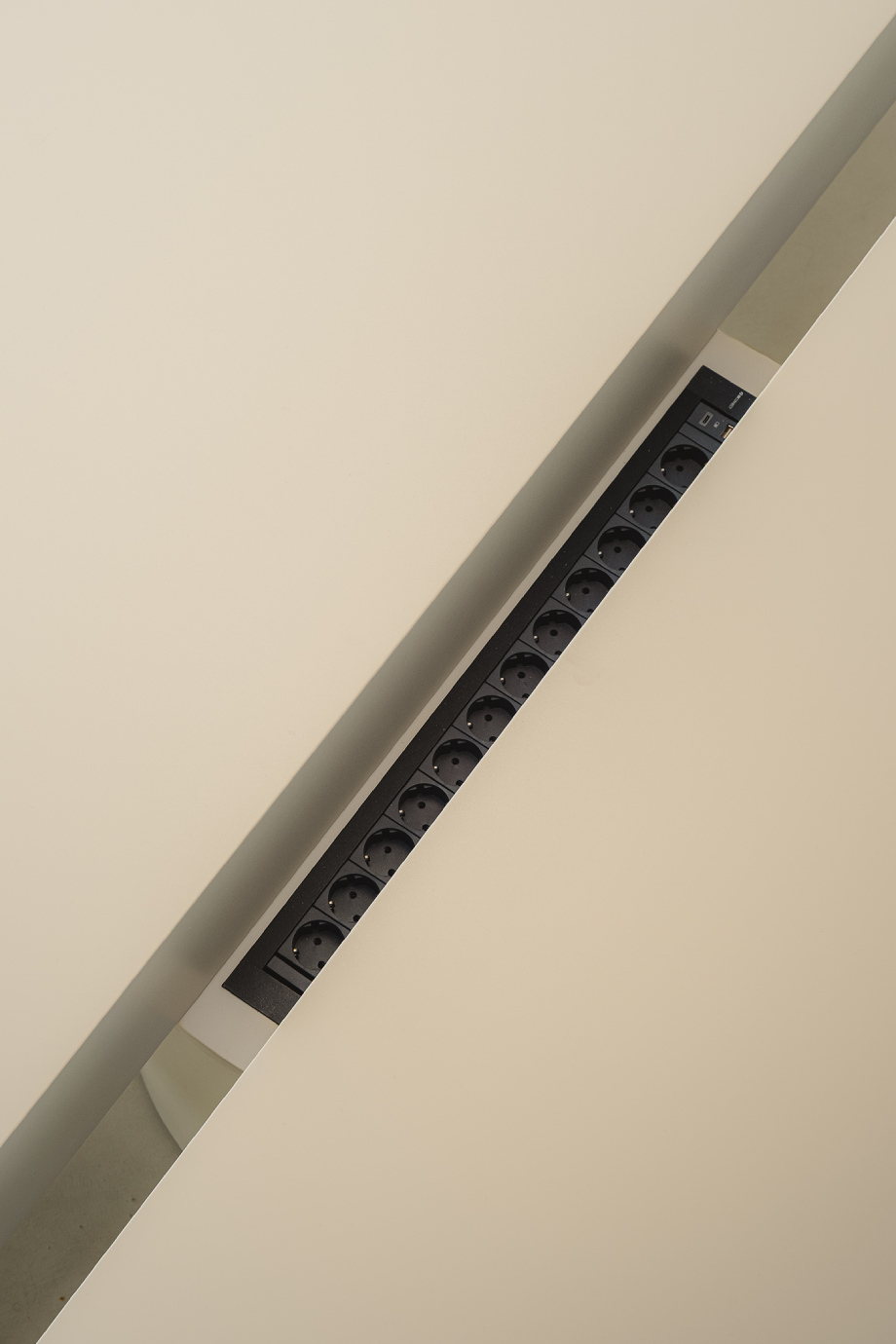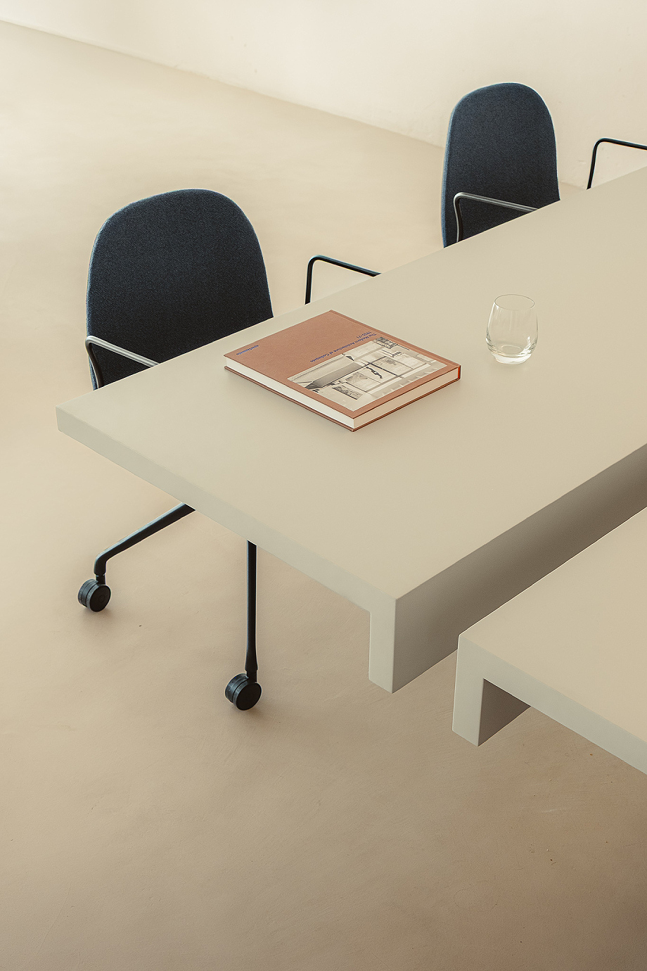 Pero Tot no es solo forma, es también una respuesta inteligente a las nuevas dinámicas laborales. Concebida como mesa bench, integra un doble sobre de 40 mm de espesor separado por una apertura central funcional. En el interior del cilindro, un discreto surco alberga un cuadro de alimentación oculto con 12 enchufes, permitiendo que varios usuarios trabajen simultáneamente sin que los cables invadan el espacio. La tecnología se integra, pero no interfiere. La funcionalidad existe, pero no domina.