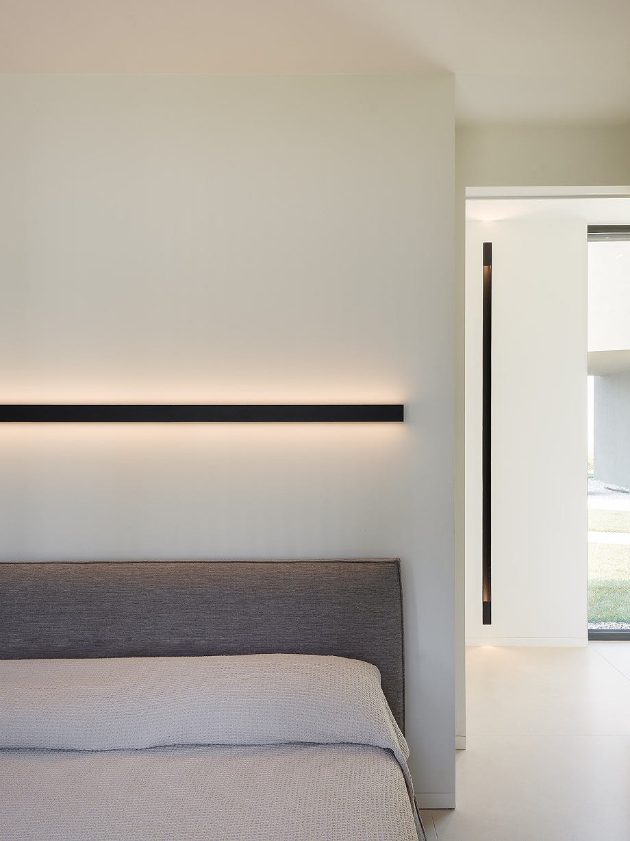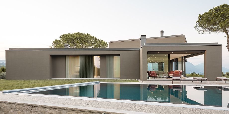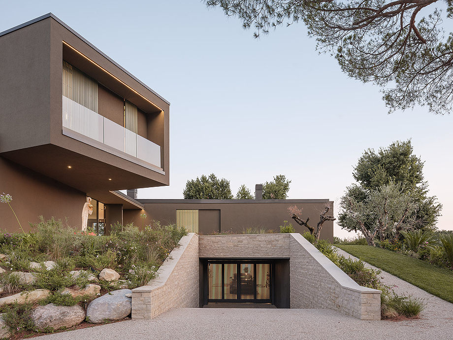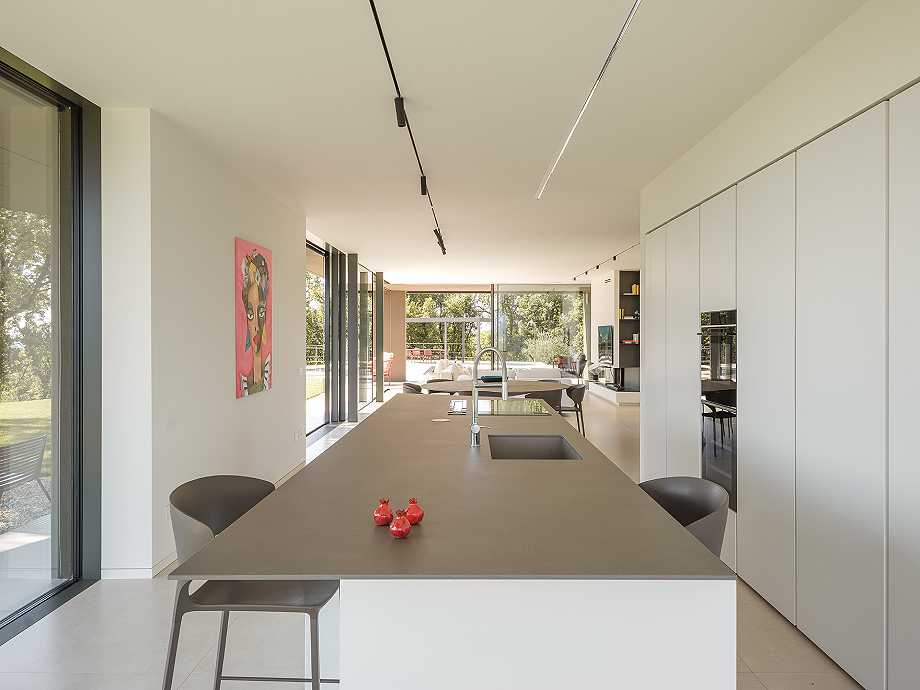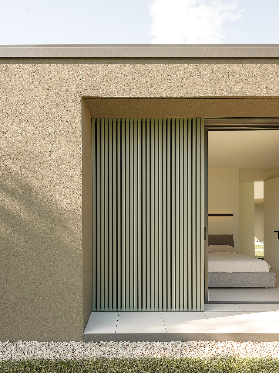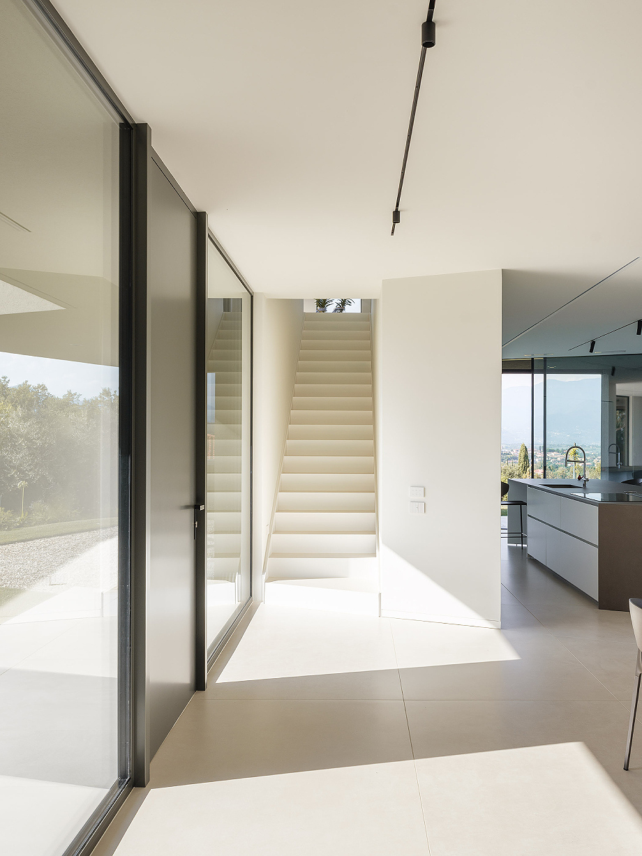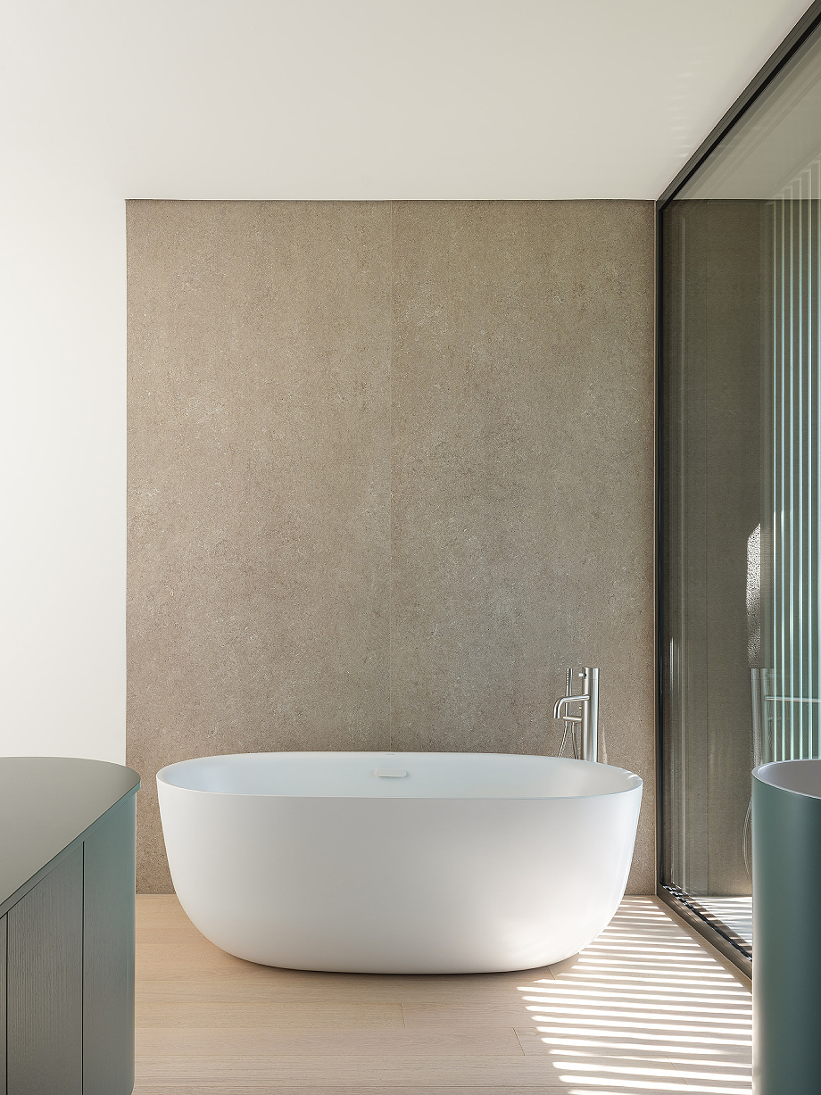 Los materiales interiores continúan la narrativa de sobriedad y elegancia: losas de gres de gran formato se alternan con tablones de roble, mientras que los revestimientos de los baños, sofisticados pero discretos, no buscan impresionar. En el exterior, el revoco rayado y la piedra de Credaro en las secciones subterráneas refuerzan la integración con el terreno.