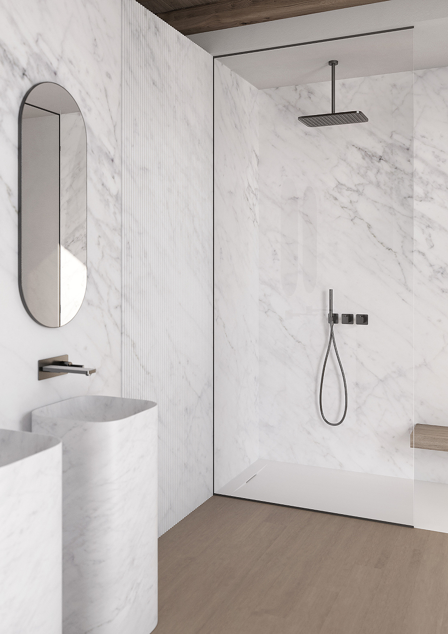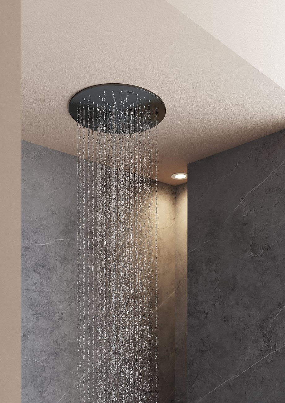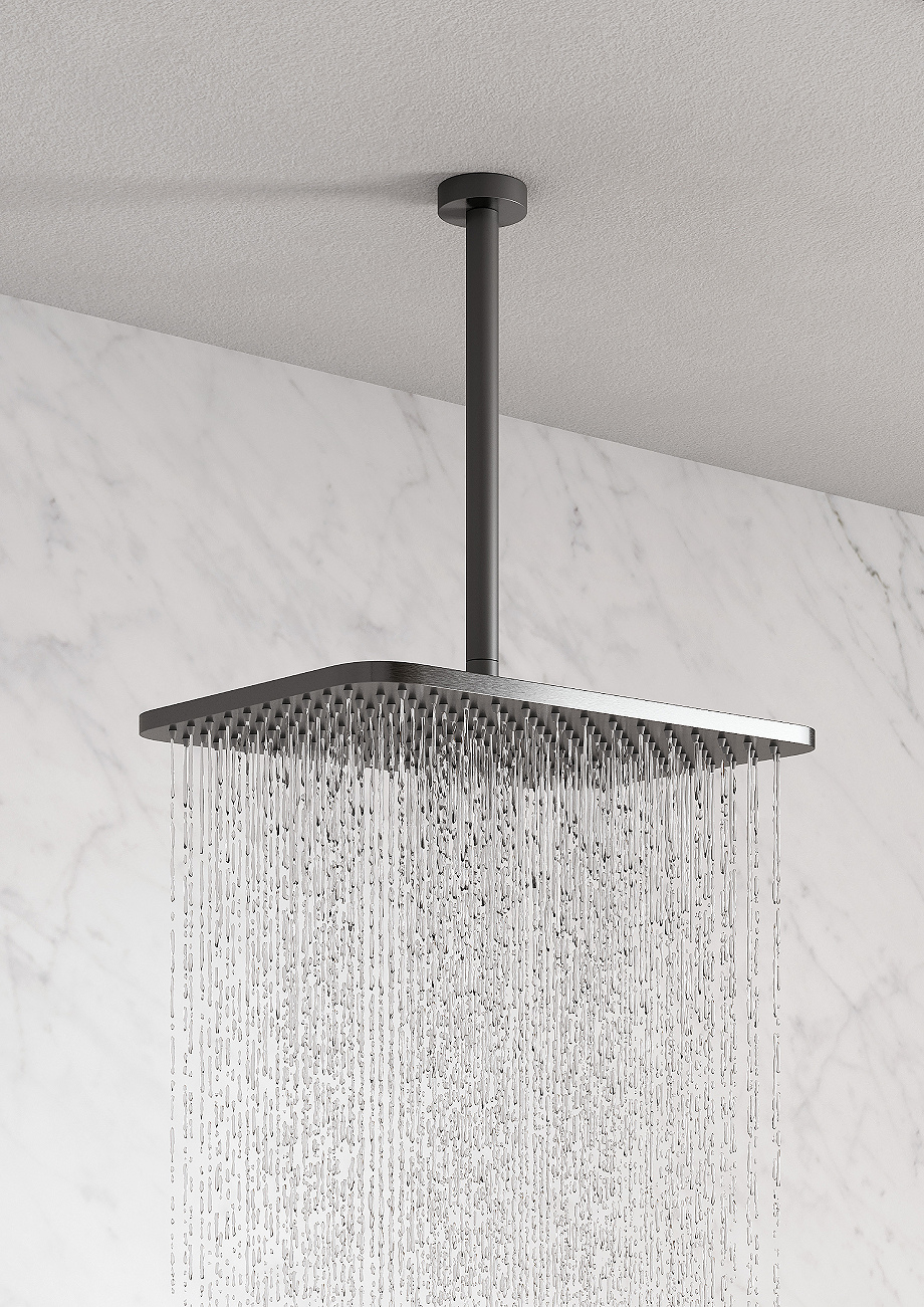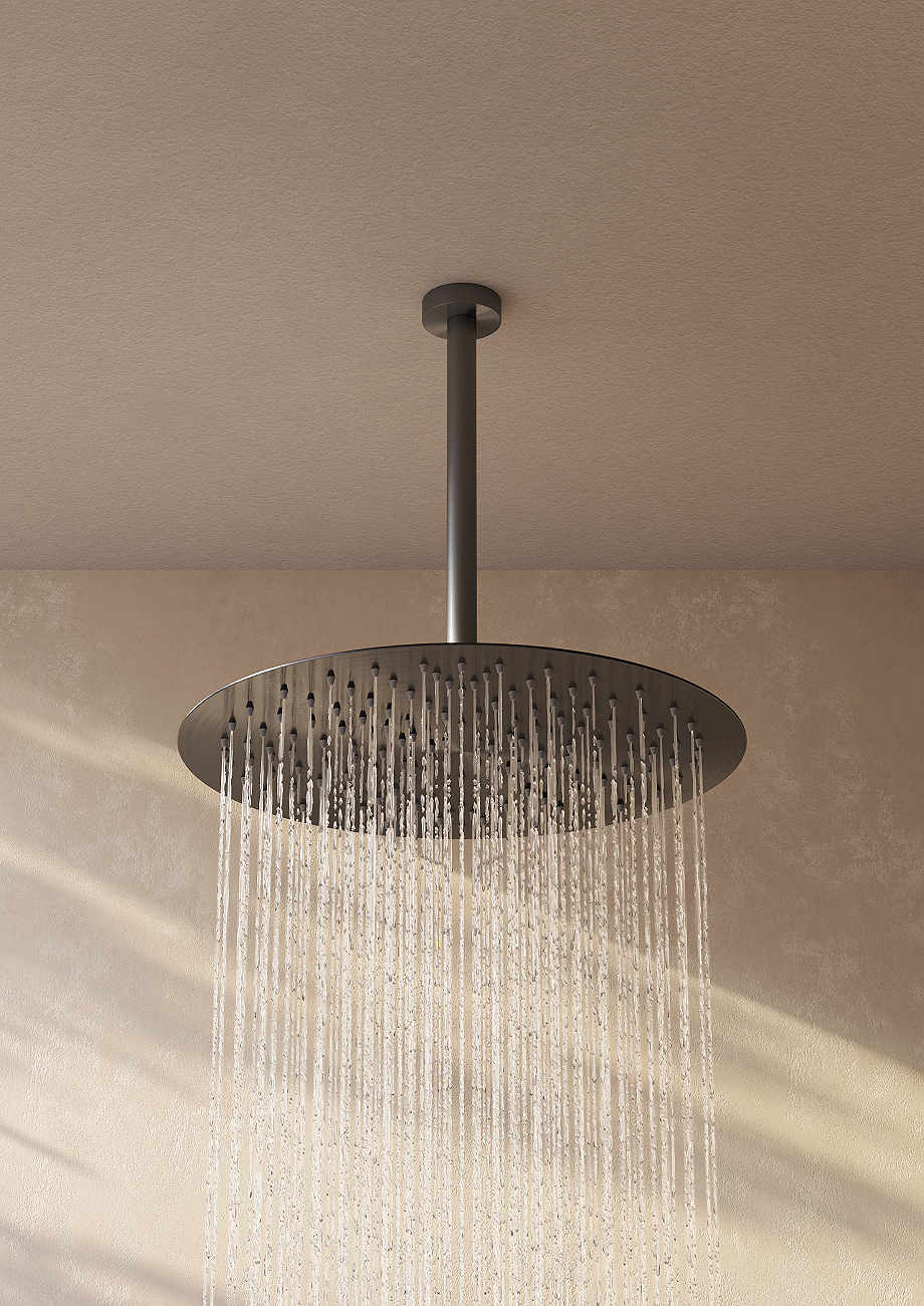 Los rociadores, disponibles en versiones redondas o rectangulares, se integran en el techo como auténticos elementos arquitectónicos, mientras que los mandos empotrados mantienen la continuidad visual de las superficies. La grifería desaparece para dejar protagonismo al espacio, reforzando una estética limpia y ordenada.