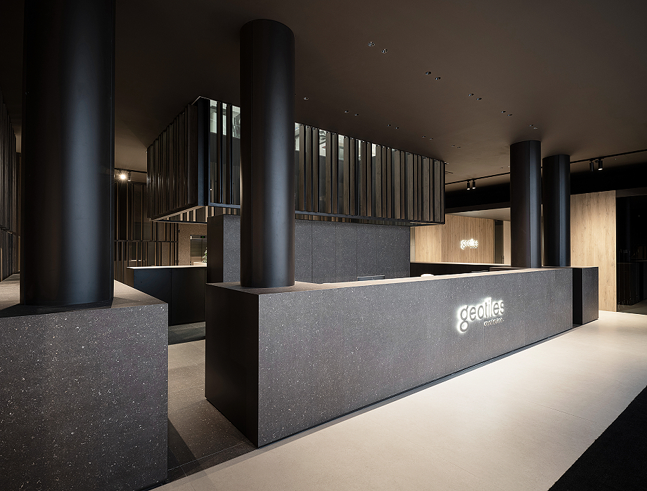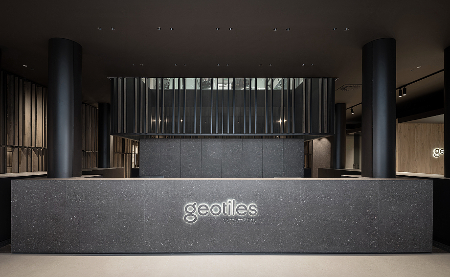 El showroom de Geotiles presenta más de 2.000 referencias cerámicas, distribuidas en 26 ambientes técnicos y cuatro espacios a escala real que remiten a interiores domésticos. La exposición se organiza según familias de producto -maderas, piedras, mármoles, cementos y grandes formatos-, alternando zonas de carácter técnico con diferentes ambientes a escala real. Esta combinación permite que los muros de muestra convivan con espacios vividos, logrando un equilibrio entre la abstracción del producto y la experiencia práctica, ya sea residencial o profesional. La arquitectura, discreta y funcional, sirve como marco que ordena la exposición y potencia la presentación de los materiales sin imponerse a ellos.