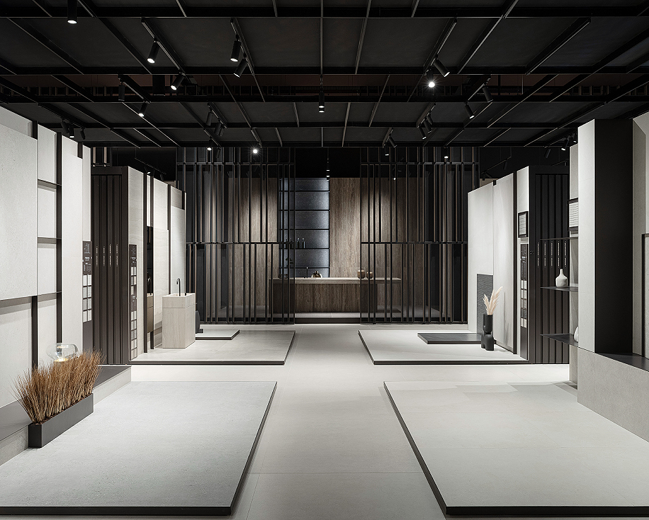 El interior del espacio expositivo se desarrolla siguiendo un progresivo grado de abstracción y concreción. Al inicio, la cerámica se muestra en su estado más puro, centrada en sus cualidades materiales y táctiles. A medida que avanza el recorrido, los espacios adquieren un carácter más definido, simulando entornos próximos a la realidad, hasta desembocar en un loft final, donde los ambientes son completamente realistas y los revestimientos cerámicos funcionan como superficies integradas en elementos con un uso concreto.
