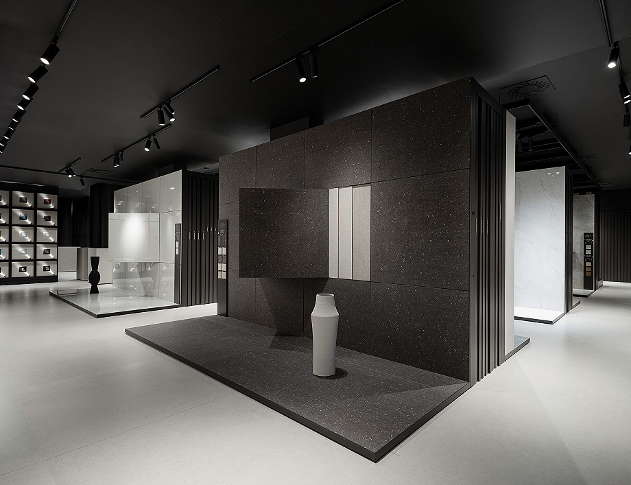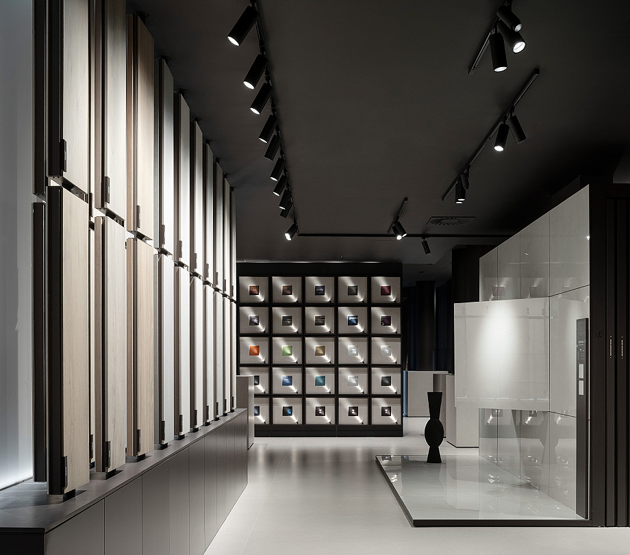 La iluminación juega un papel central en esta experiencia. Cada área está diseñada para resaltar texturas, formas y detalles de los materiales mediante un sistema lumínico interactivo de última generación, que se activa con la presencia de los visitantes. La combinación de luz rasante y puntual potencia vetas, relieves y uniones, mientras que la iluminación uniforme asegura la correcta apreciación técnica de cada pieza. El resultado es una atmósfera cuidadosamente controlada, casi de museo, que invita a recorrer los espacios con calma y a descubrir la riqueza material de la cerámica en cada escala.