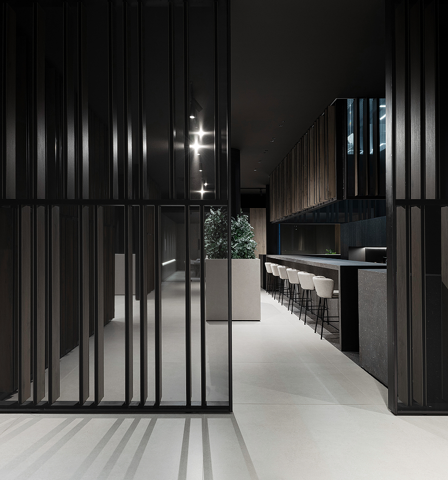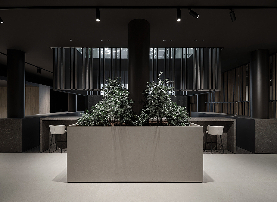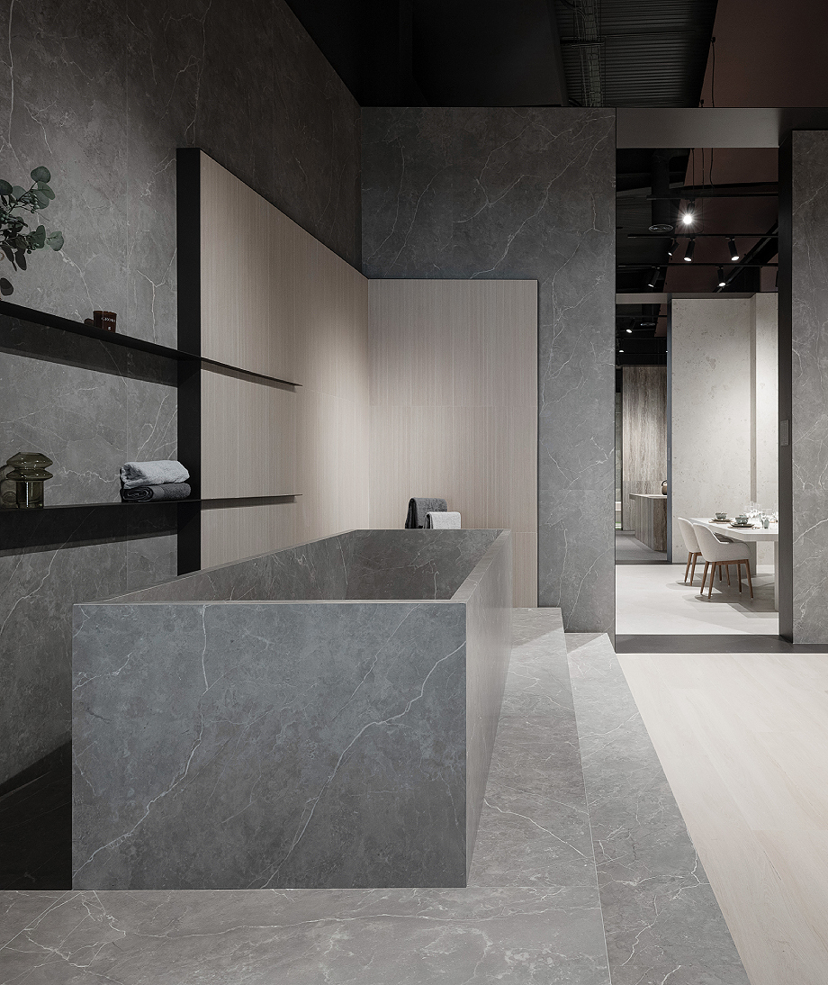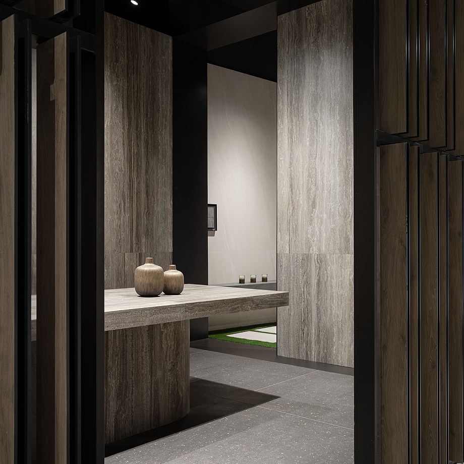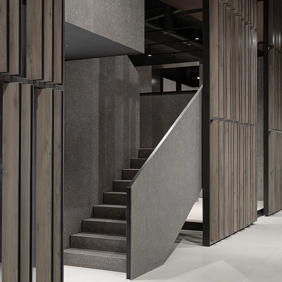 Jose María Gimeno y Andrés Navarro, fundadores de Summumstudio, han planteado una arquitectura interior sobria y atemporal, donde «la cerámica se libera de su condición aplicada para convertirse en volumen, masa y plano constructivo. Escaleras, bancadas, mesas, plataformas y muros se resuelven como piezas cerámicas de gran formato, integradas en el propio sistema espacial», explican. Esta decisión permite mostrar el material en condiciones reales de uso, reforzando su dimensión arquitectónica y técnica.