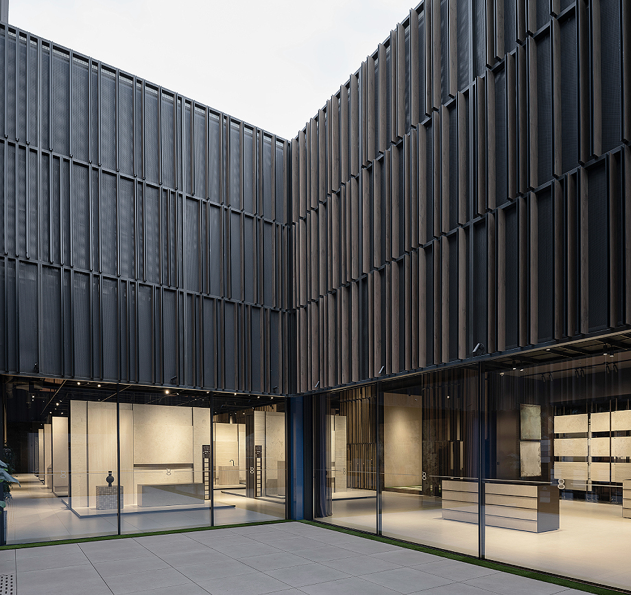 Un elemento tan mediterráneo como la celosía se convierte en una herramienta clave para organizar el recorrido dentro del showroom. Aparece en la coronación del vestíbulo de entrada y del mostrador, desplegándose como una piel lineal que acompaña al visitante y define la trayectoria a seguir. Su colocación permite revelar o esconder los distintos ambientes de manera controlada, creando una estrategia visual que conduce gradualmente hacia el patio interior abierto, donde la celosía se transforma en la envolvente que articula todo el conjunto.