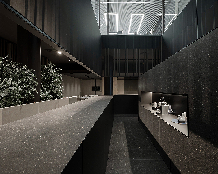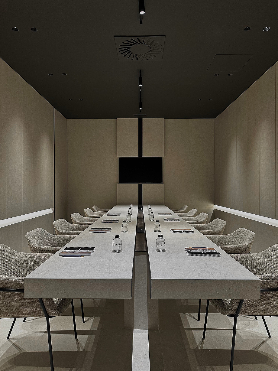 El proyecto se completa con salas de reunión, zonas de trabajo y espacios de atención profesional, completamente integrados en el discurso arquitectónico. Destaca un espacio delimitado por una amplia cristalera que ofrece vistas directas a la fábrica, brindando la oportunidad de observar el proceso de producción en tiempo real y apreciar la tecnología y el conocimiento técnico de la empresa. Estos ámbitos refuerzan la concepción del espacio como un entorno funcional, donde la actividad y la experiencia conviven con la exhibición, más allá de su carácter puramente representativo.
