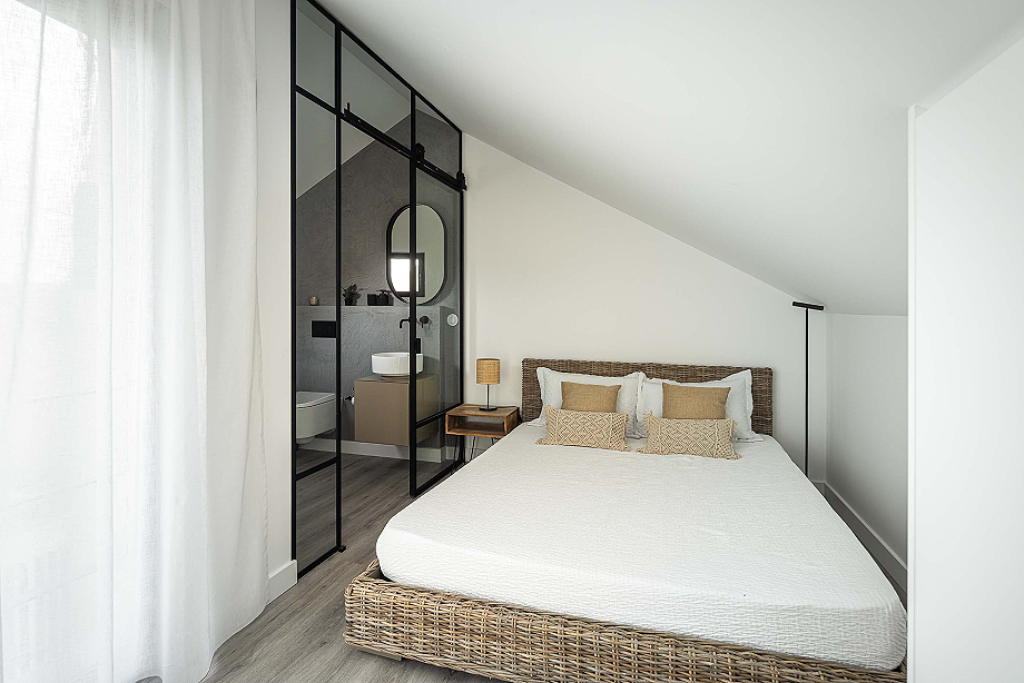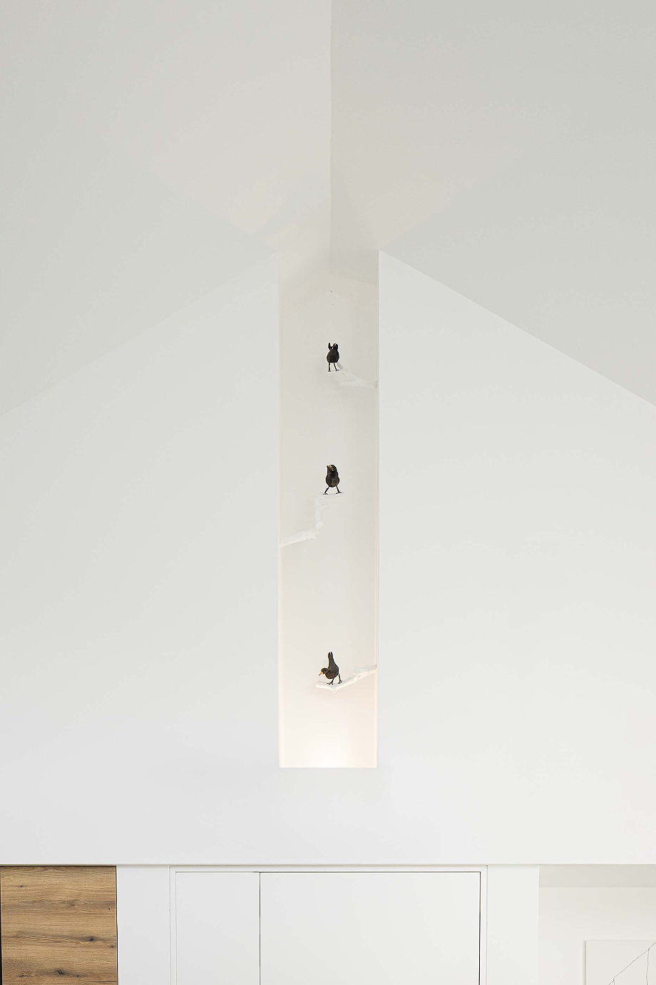 En el interior, se combina esta diversidad espacial con objetos cuidadosamente seleccionados: muebles de anticuario, elementos naturales utilizados como piezas decorativas y varias piezas artesanales creadas por el propio arquitecto. Entre ellas, destacan la escultura de un mirlo ubicada en el nicho sobre la entrada -una referencia al pueblo de Melroeira, llamado así por la abundancia de mirlos en la zona-, las diversas pinturas que representan mirlos o perspectivas de la casa, la lámpara del entrepiso, hecha a mano, y la lámpara del comedor, reutilizada. Estos elementos conviven armoniosamente con piezas decorativas sencillas disponibles comercialmente e, incluso, con la silla Shell de Hans Wegner, también adquirida de segunda mano.