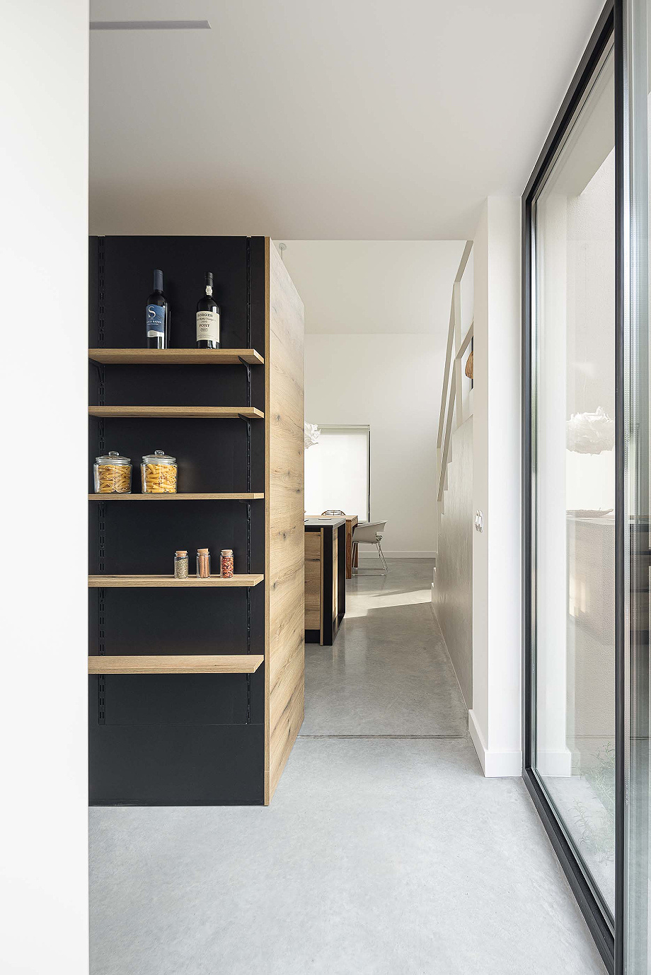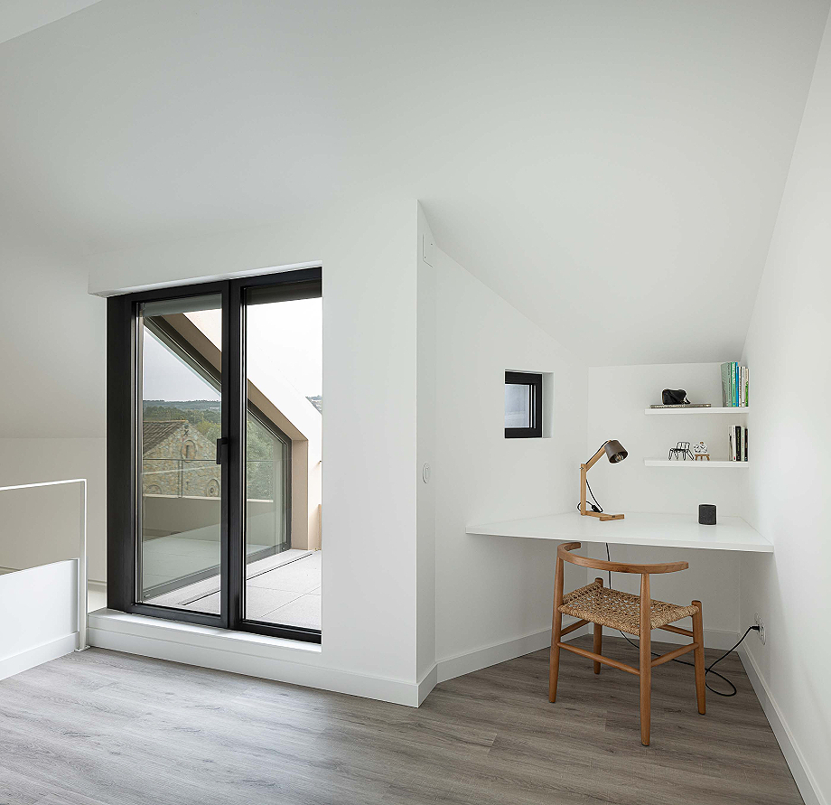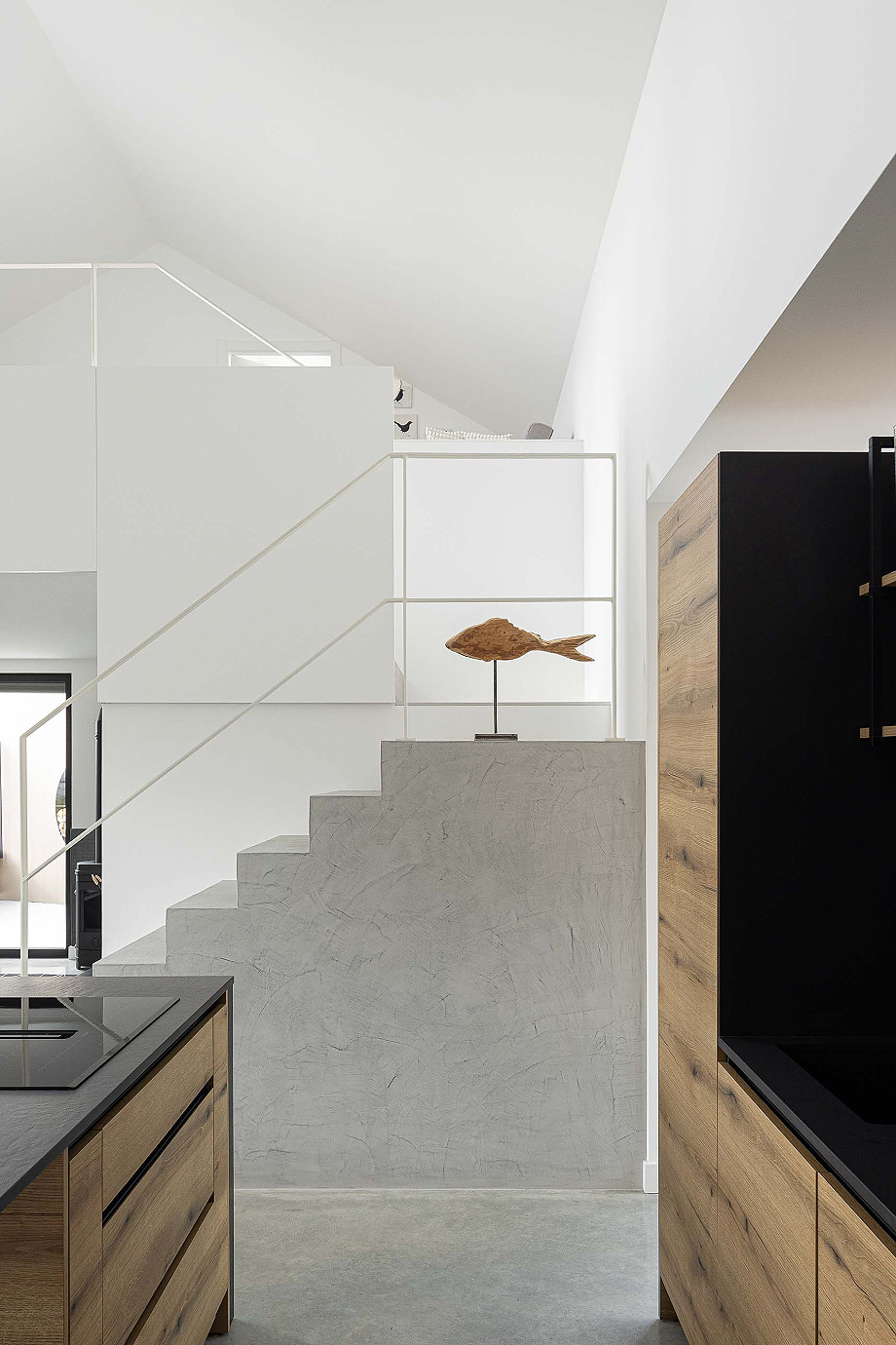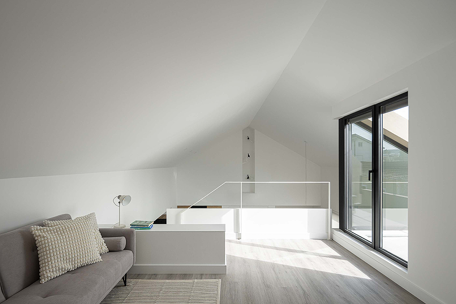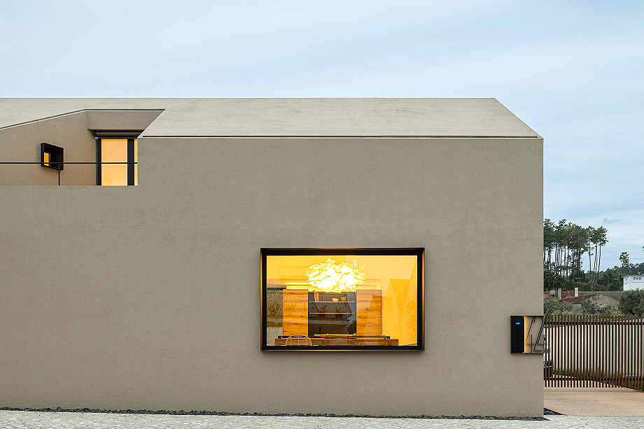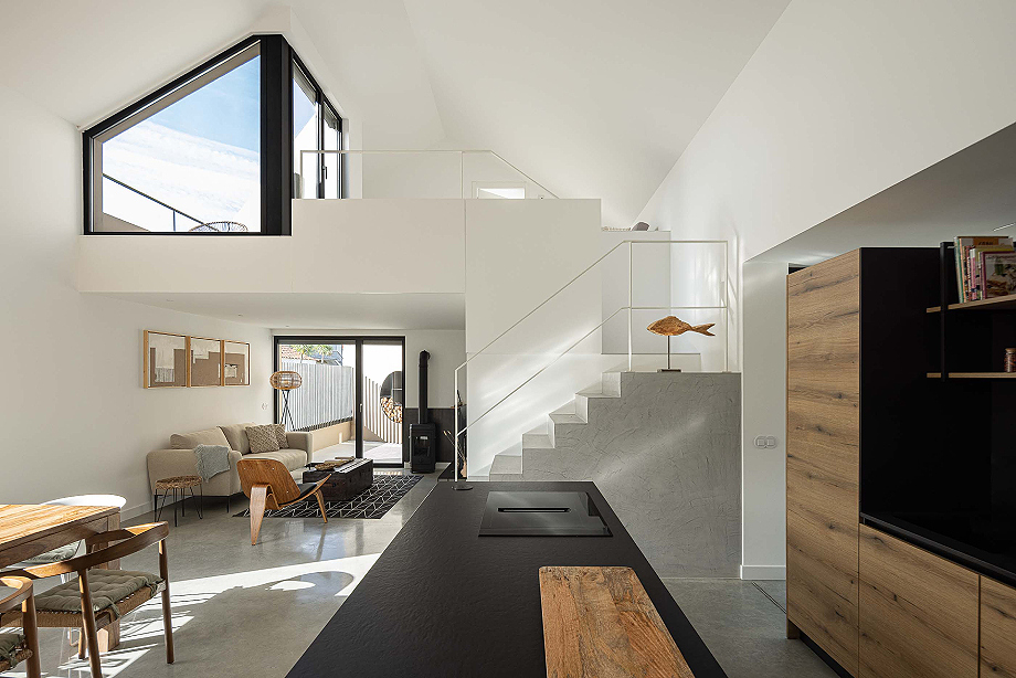 La experiencia de hogar se construye alrededor de la percepción espacial. «Cuando pensamos en un hogar, inevitablemente lo asociamos con una sensación de refugio y un espacio que contribuye emocionalmente a nuestro bienestar», explica el arquitecto Filipe Saraiva. Al entrar en la casa, la presencia inmediata de un espacio a doble altura, que aprovecha la forma pentagonal del volumen, crea una sensación de amplitud que da paso a zonas más íntimas y envolventes.