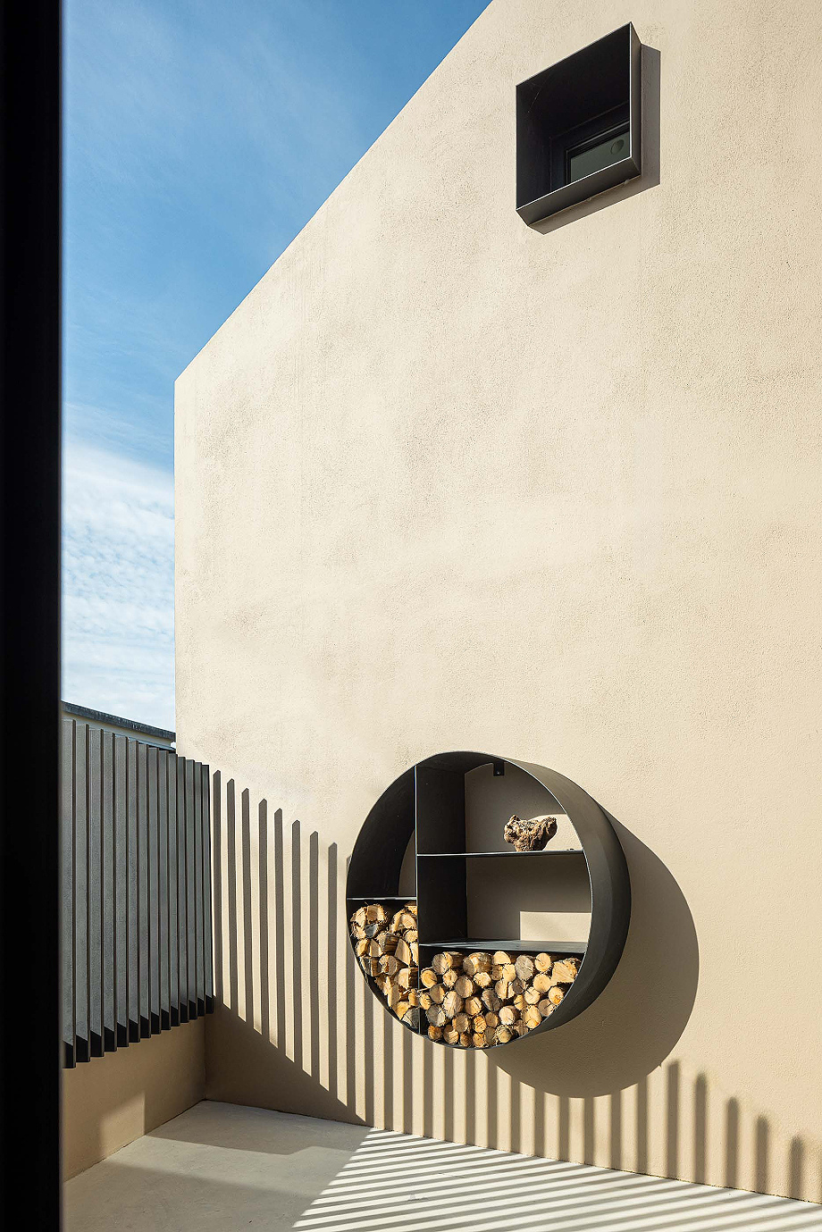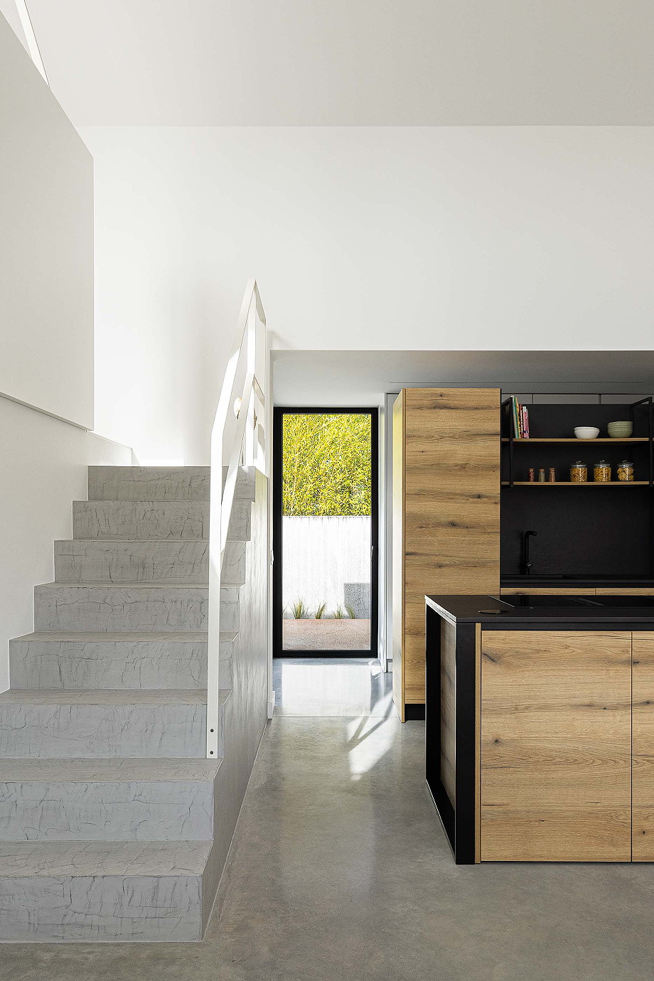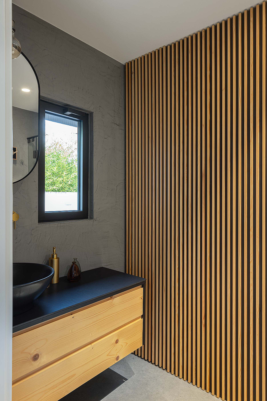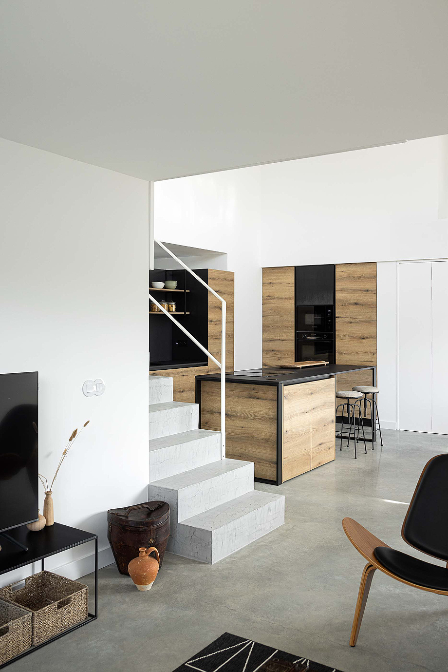La experiencia de hogar se construye alrededor de la percepción espacial. «Cuando pensamos en un hogar, inevitablemente lo asociamos con una sensación de refugio y un espacio que contribuye emocionalmente a nuestro bienestar», explica el arquitecto Filipe Saraiva. Al entrar en la casa, la presencia inmediata de un espacio a doble altura, que aprovecha la forma pentagonal del volumen, crea una sensación de amplitud que da paso a zonas más íntimas y envolventes.