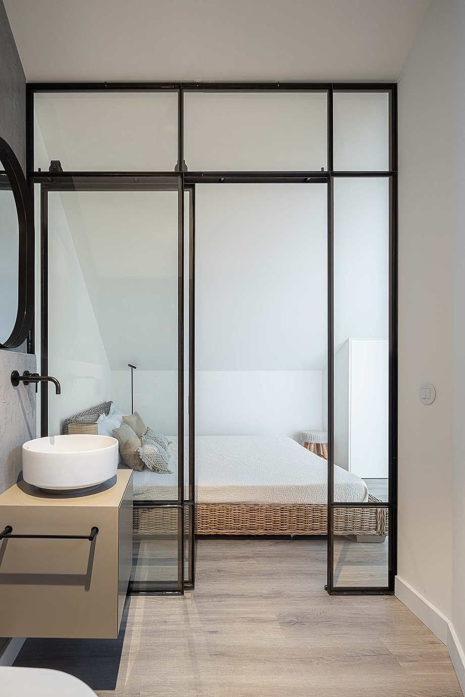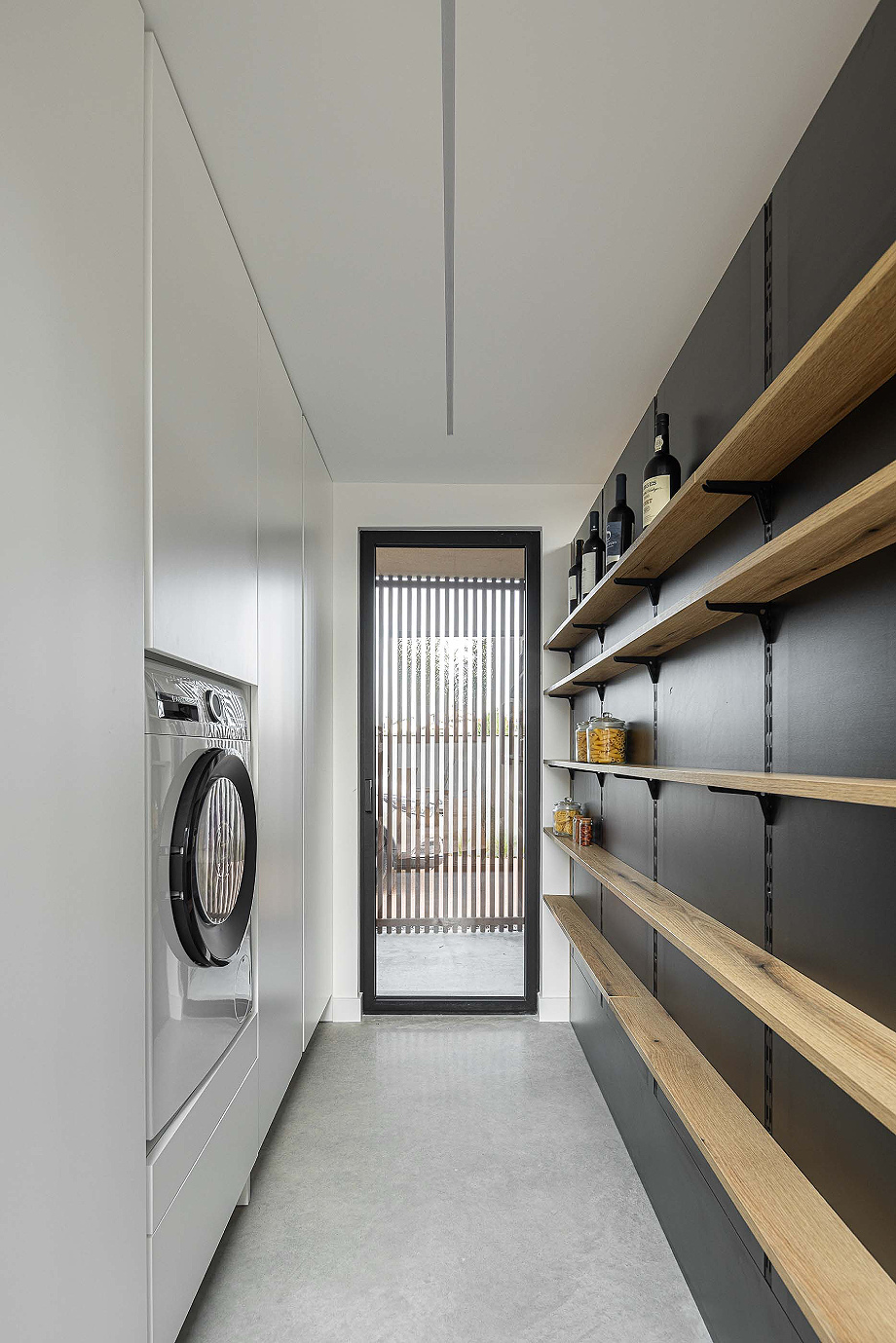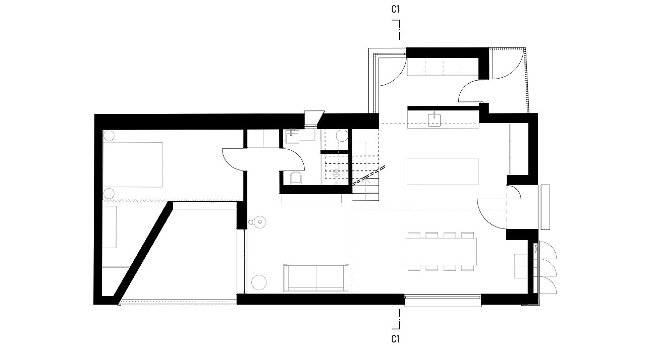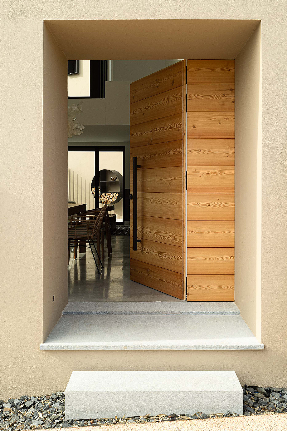 La experiencia de hogar se construye alrededor de la percepción espacial. «Cuando pensamos en un hogar, inevitablemente lo asociamos con una sensación de refugio y un espacio que contribuye emocionalmente a nuestro bienestar», explica el arquitecto Filipe Saraiva. Al entrar en la casa, la presencia inmediata de un espacio a doble altura, que aprovecha la forma pentagonal del volumen, crea una sensación de amplitud que da paso a zonas más íntimas y envolventes.