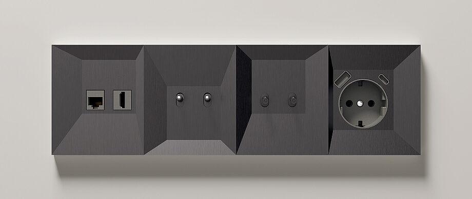 Esta colección de mecanismos eléctricos propone una reinterpretación del dinamismo generado por la sucesión de planos rectos y angulados, que aporta profundidad y tensión visual incluso en un elemento tan cotidiano como un simple enchufe. Su diseño se inspira en la elegante fachada industrializada que Morph desarrolló para el hotel Nido Príncipe Pío en Madrid, trasladando a pequeña escala la misma geometría y fuerza compositiva.
