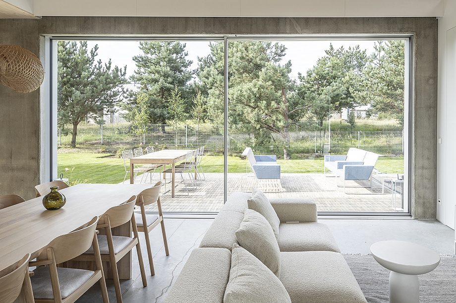 El diseño, tanto interior como exterior, apuesta por una sobriedad discreta: tonos suaves, materiales naturales y ausencia de elementos superfluos. Desde el primer momento, la casa transmite calma y serenidad. Las grandes superficies acristaladas, la amplia terraza y la vegetación cuidadosamente seleccionada diluyen la frontera entre interior y paisaje, incorporando el entorno al corazón del hogar. El paisajismo es obra de topoScape, un estudio reconocido por su nominación al Premio Mies van der Rohe 2025 por el Túmulo del Levantamiento de Varsovia.