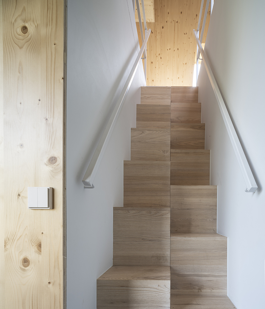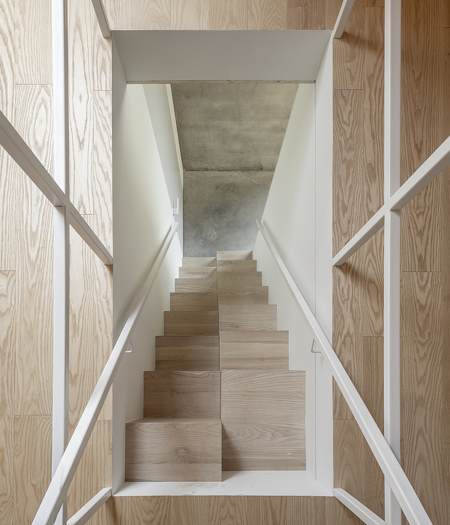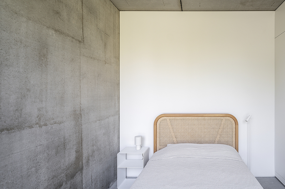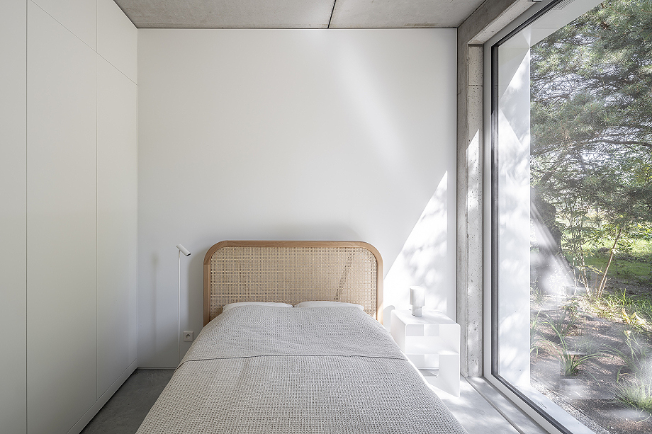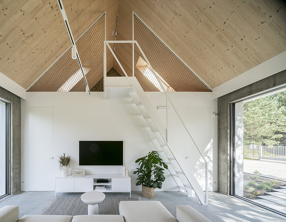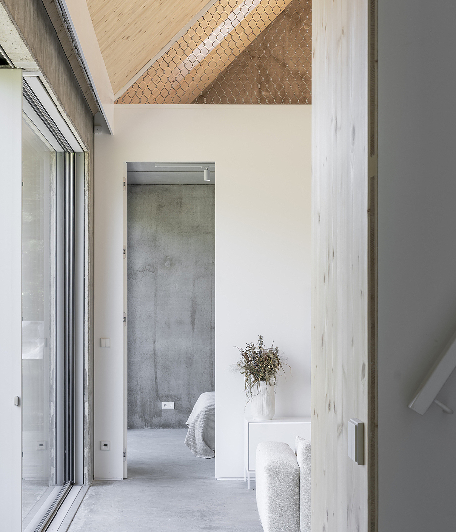La paleta interior se centra en la madera de fresno y abeto, presente en los aleros de la cubierta, la escalera, el suelo del altillo y los frentes de la cocina, combinada con el hormigón arquitectónico que cubre la planta baja. Los grandes ventanales de marco delgado y altura completa destacan por su presencia, mientras elegantes puertas correderas abren la casa en dos direcciones: hacia la terraza y el jardín, y hacia la fachada principal. Cada dormitorio de la planta baja cuenta además con acceso directo e independiente al jardín, integrando el exterior en la experiencia diaria del hogar.