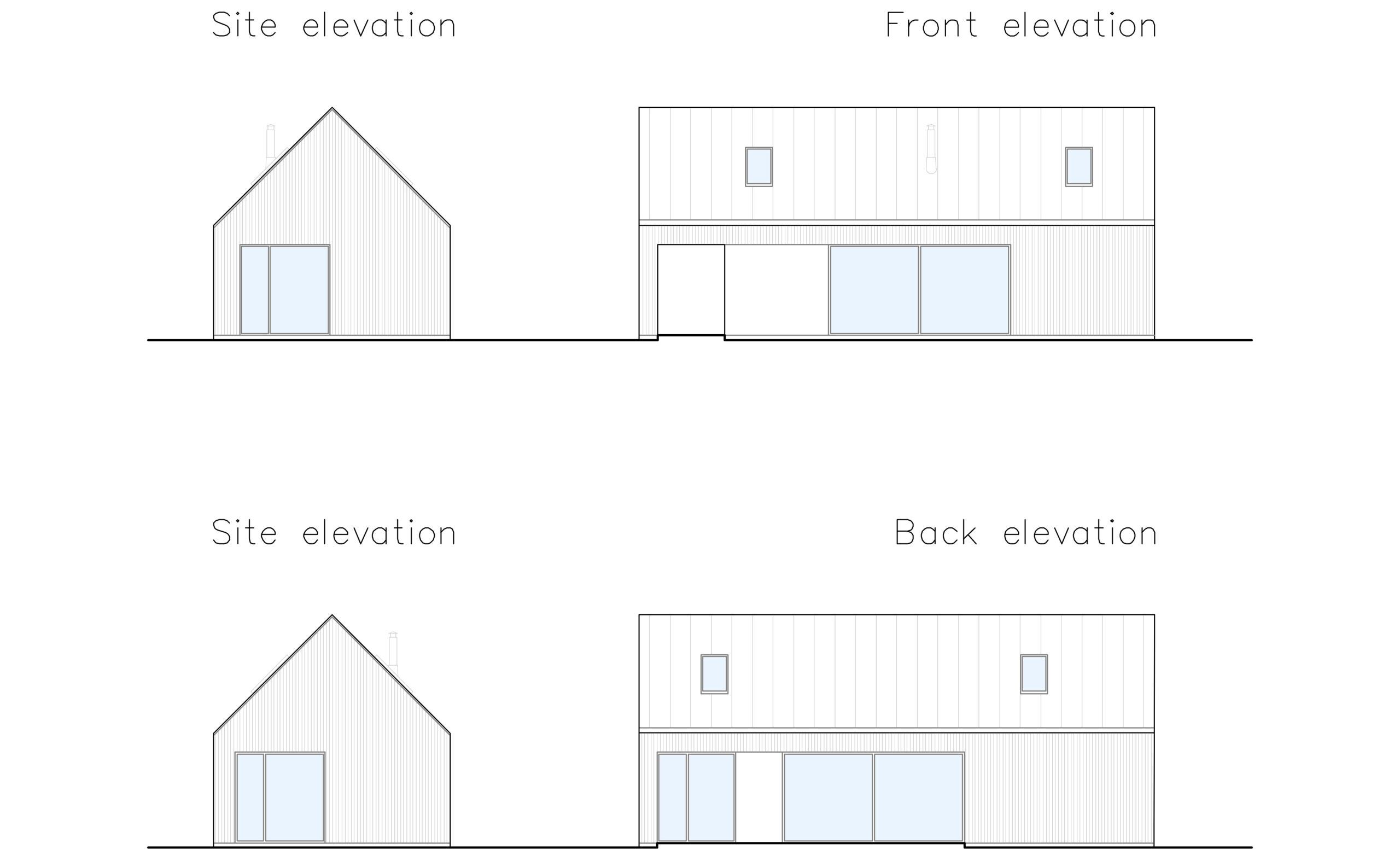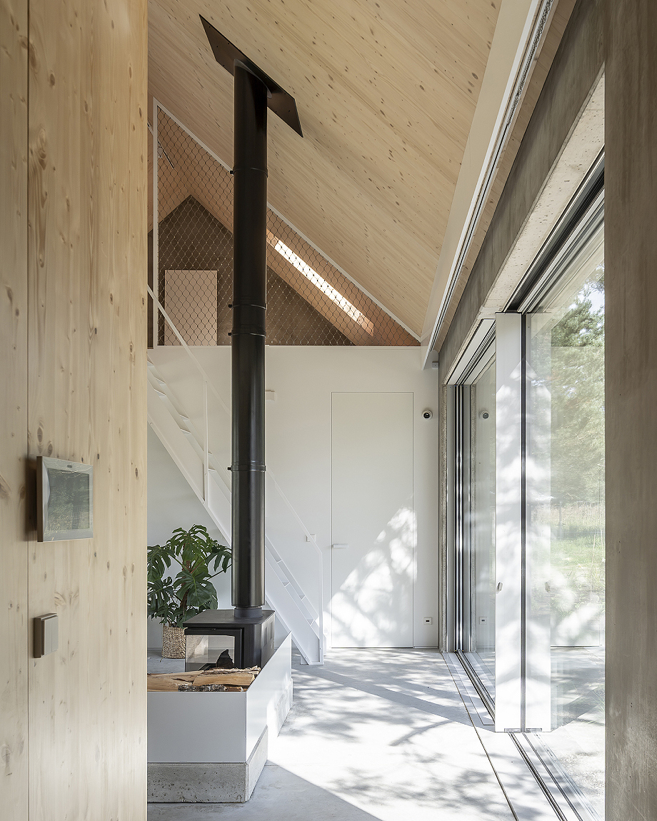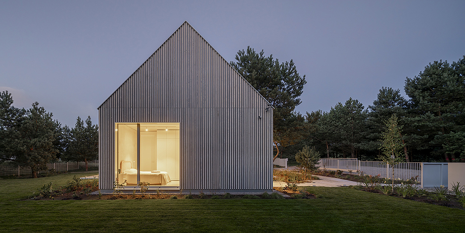 La arquitectura de la casa está inspirada en las clásicas casas de campo de las regiones de Masuria y Warmia, en el noroeste de Polonia, con una sencilla planta rectangular sobre la que descansa una cubierta a dos aguas. La envolvente combina una fachada ventilada de panel composite de aluminio (ACP) con listones de alerce siberiano termo-carbonizado, carpinterías de aluminio y una cubierta metálica de junta alzada continua. La madera se carbonizó utilizando el método centenario japonés conocido como Shou Sugi Ban, que otorga un acabado impactante y texturizado, a la vez que garantiza una durabilidad excepcional. «Con el tiempo, la madera se ablandará y adquirirá una tonalidad plateada, permitiendo que las casas se integren aún más en el paisaje boscoso», apunta el arquitecto.