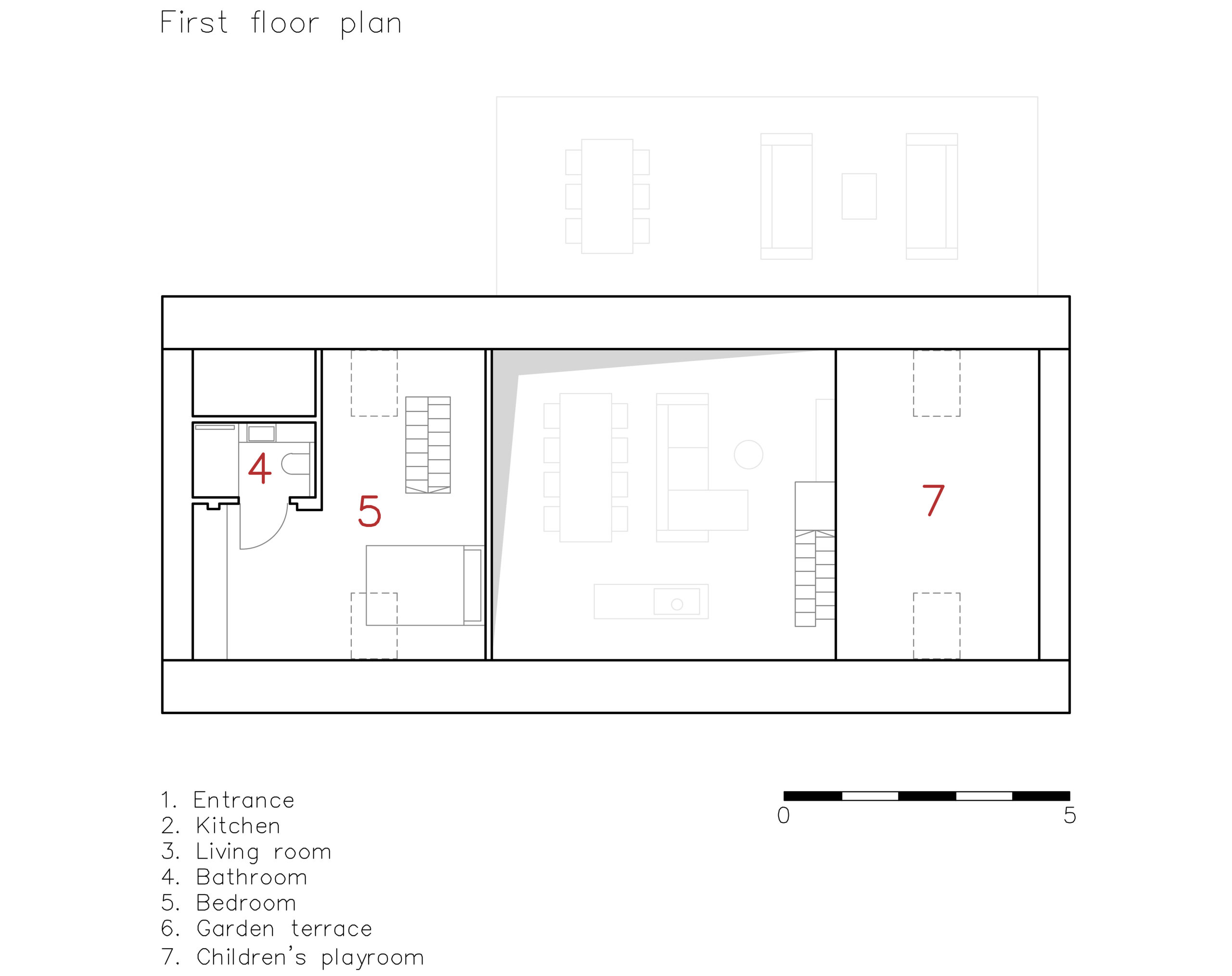La distribución interior fomenta la vida familiar al tiempo que ofrece a cada miembro su propio espacio. El corazón de la casa lo constituye una sala de estar a doble altura con una chimenea, abierto al comedor y a la cocina. Tres dormitorios, incluyendo una suite principal con baño en suite, se distribuyen a ambos lados. Una escultural escalera asciende desde el centro de la planta hasta un altillo abierto que puede utilizarse como espacio de trabajo o zona de juegos infantil. El extremo opuesto está ocupado por un dormitorio adicional con baño propio.