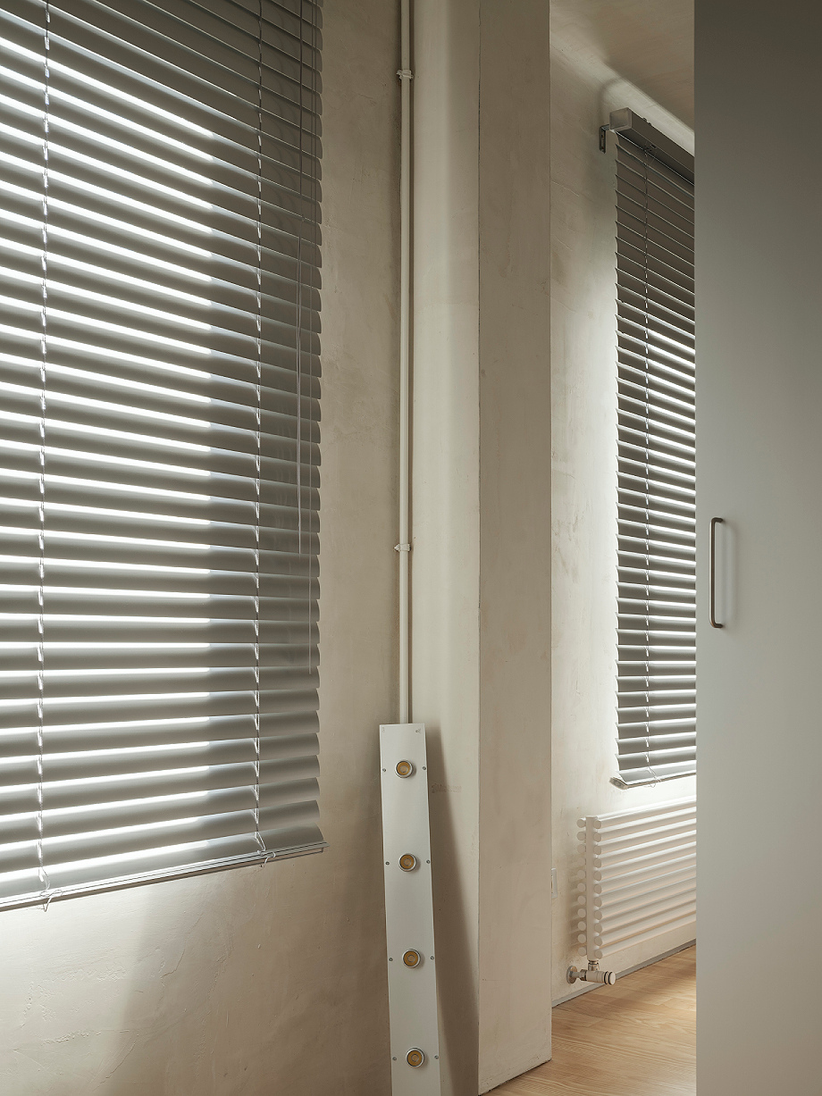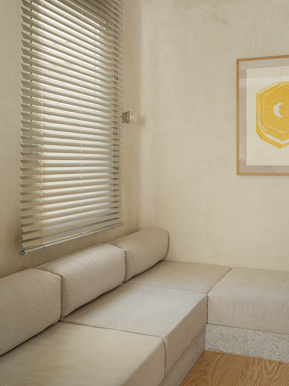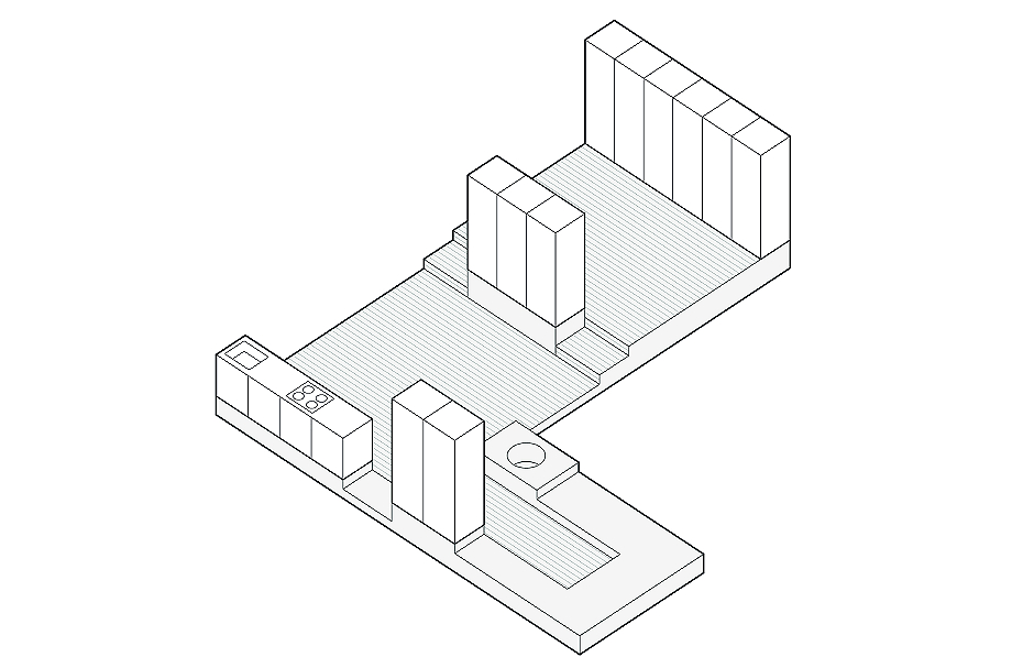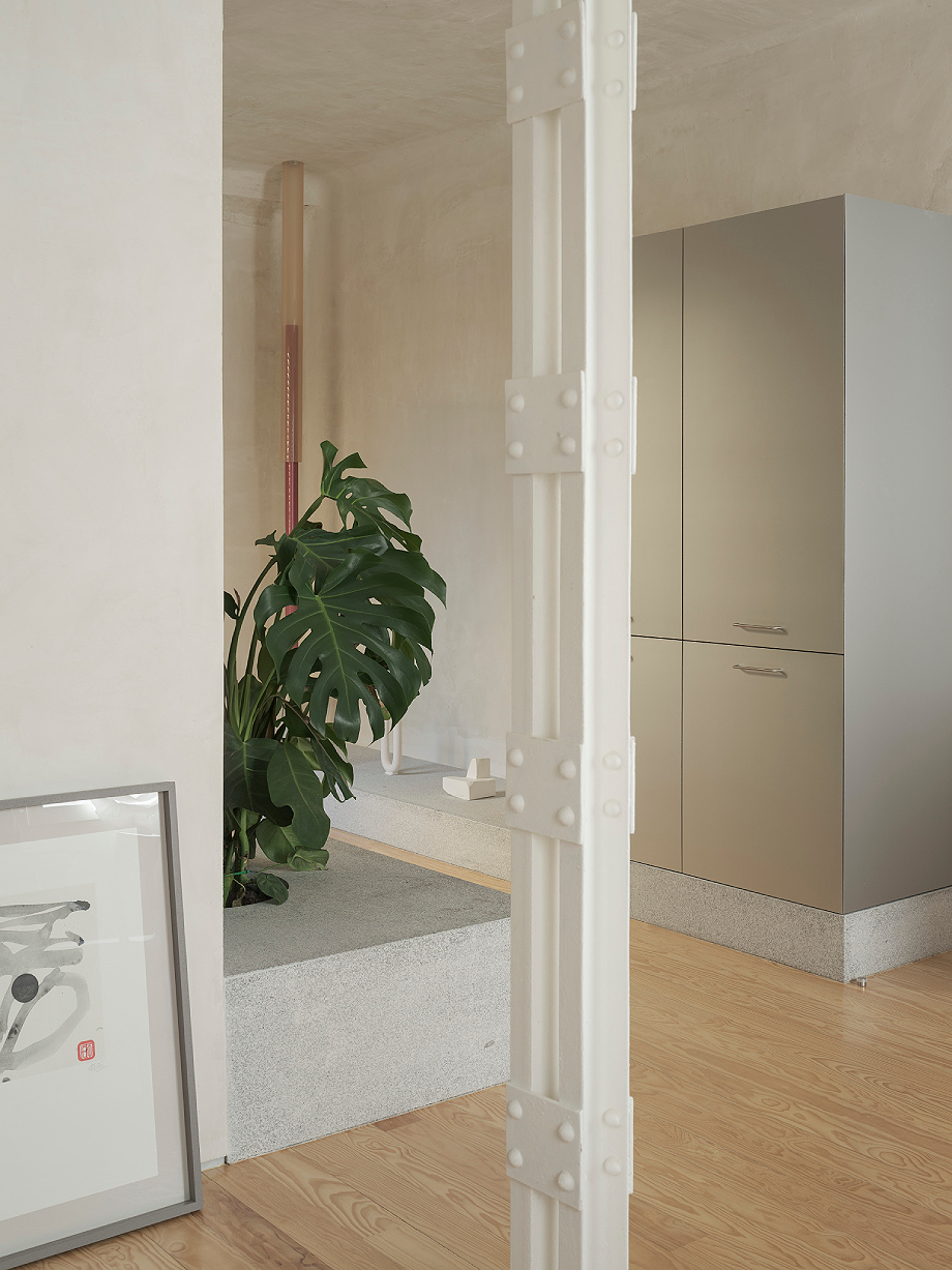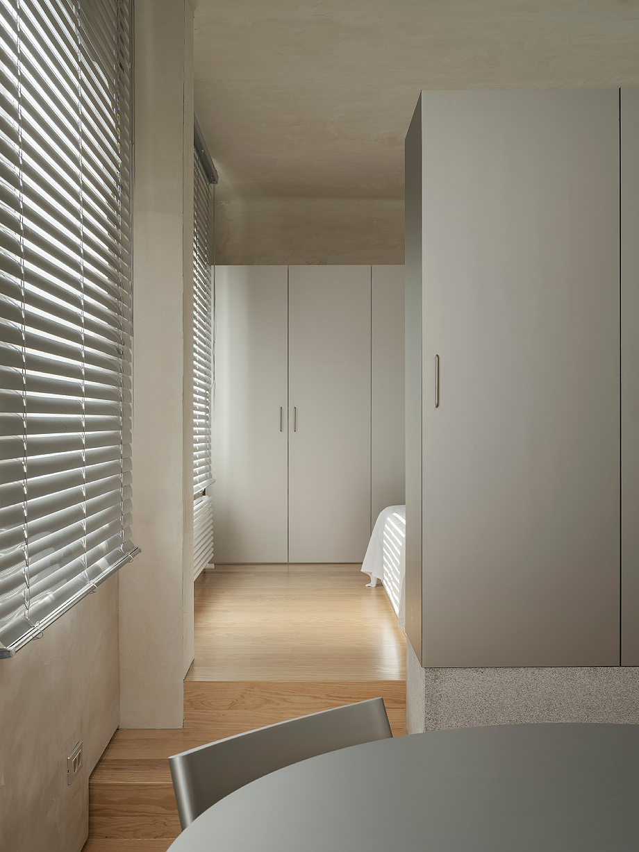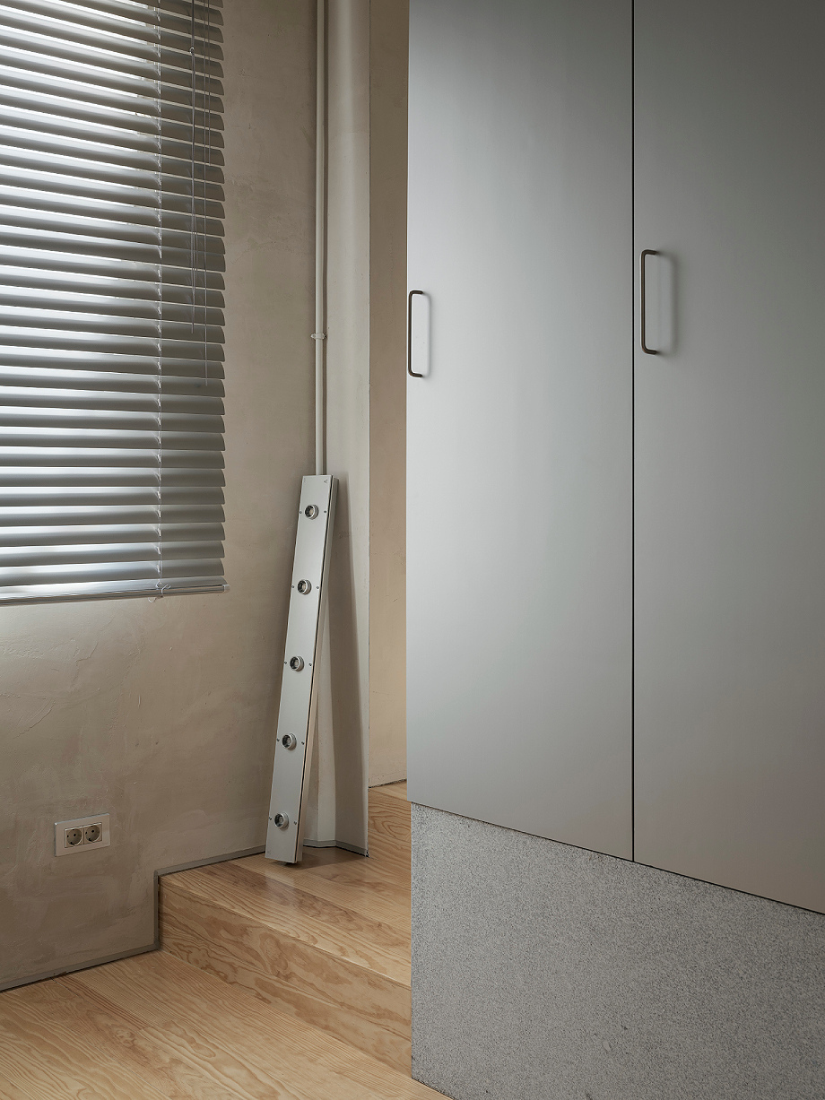 La propuesta del despacho de arquitectura se basa en un espacio abierto articulado por niveles diferenciados, que permiten delimitar las funciones propias de una vivienda. Los zócalos de granito funcionan como puntos de apoyo para el mobiliario, la cama, la cocina o los armarios, integrando cada pieza de diseño dentro del conjunto arquitectónico. Este planteamiento crea un paisaje doméstico donde cada elemento forma parte de la arquitectura, generando una experiencia espacial unificada y coherente.