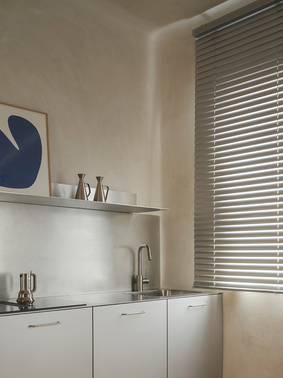 El proyecto combina superficies metálicas, zócalos de piedra natural y suelos de madera cálida, estableciendo un lenguaje material sobrio y elegante. Asimismo, la neutralidad del contenedor permite que las piezas de diseño, la iluminación y las obras de arte activen la vivienda, generando contrastes sutiles y aportando identidad al interior. La integración cuidadosa de estos elementos garantiza que cada intervención dialogue con el entorno y participe en la definición de la atmósfera.
