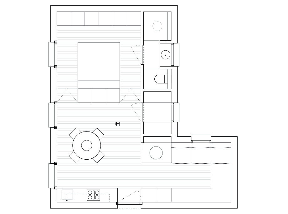 La casa nace como un espacio de investigación sobre modelos habitacionales atípicos. Con una superficie de 60 m², el proyecto optimiza cada centímetro para crear un entorno flexible y multifuncional, mientras que establece un diálogo con el exterior mediante seis grandes aperturas en tres de sus fachadas. Éstas inundan de luz el interior y amplían la percepción de la superficie real, convirtiendo el espacio en un “tablero de juego” adaptable para la disposición de los distintos elementos domésticos.